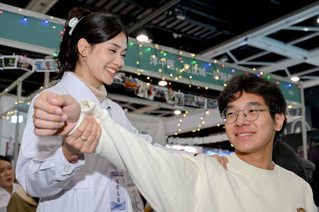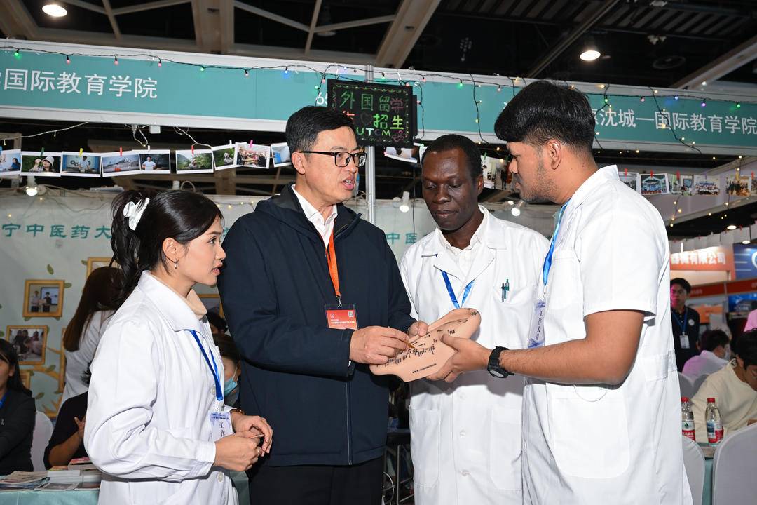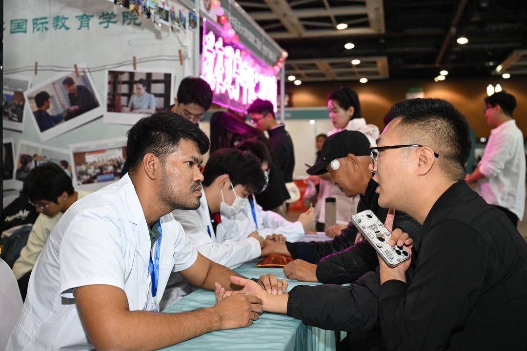 10月16日,辽宁中医药大学第二届中医药文化夜市(膏方节)在沈阳新世界博览馆拉开帷幕。辽宁中医药大学国际教育学院展区前人潮涌动,不同肤色、不同国籍的留学生为大家献上舞龙、舞蹈表演,共80余名留学生和港澳台学生参加此次活动,更有来自泰国、加纳、匈牙利等国家的留学生作为“洋中医”坐诊把脉,他们用流利的中文以及专业的中医术语与市民交流,展现中医药文化的国际魅力,吸引众多体验者驻足参与。