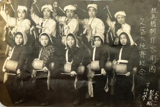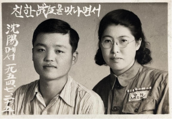 身穿中国人民志愿军军服的金润素与朝鲜战友的合影。