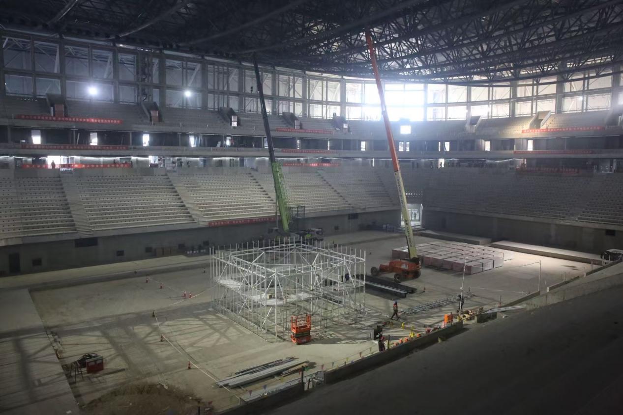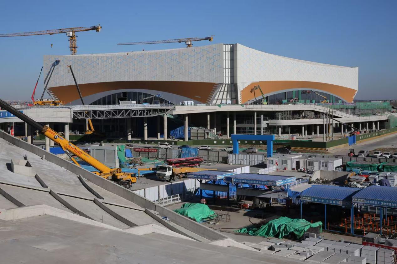 在沈阳王家湾冰上运动中心施工现场内,塔吊林立、机械轰鸣,工人们正抢抓工期推进项目建设。