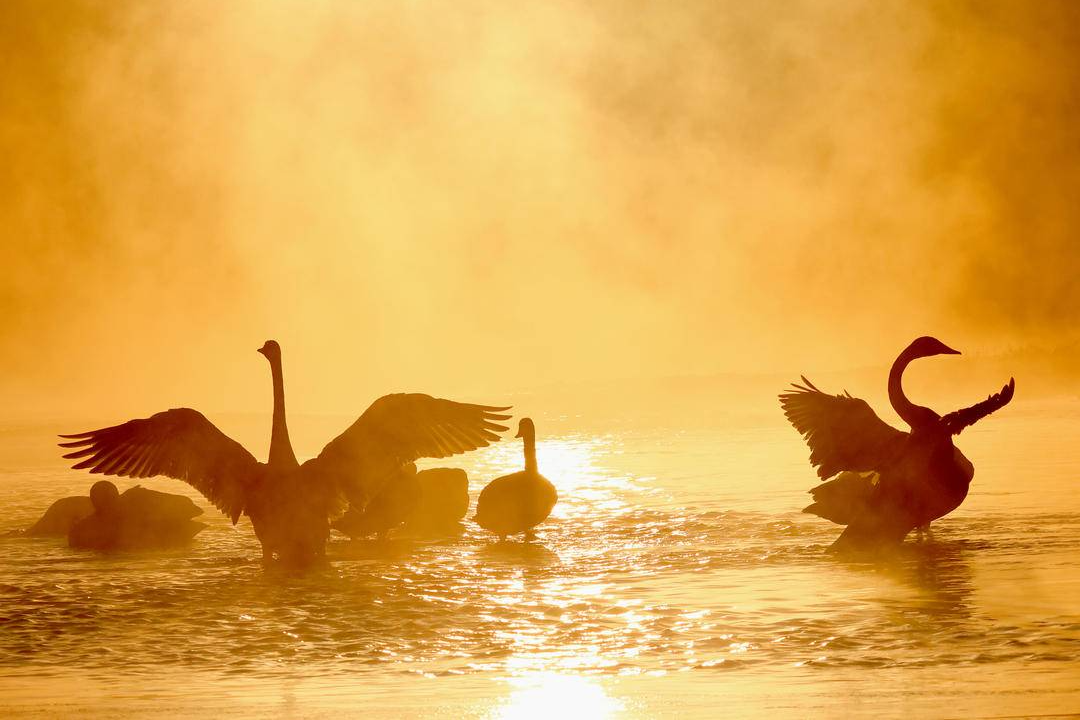 霧が立ち昇り、鳥が群れ飛ぶ