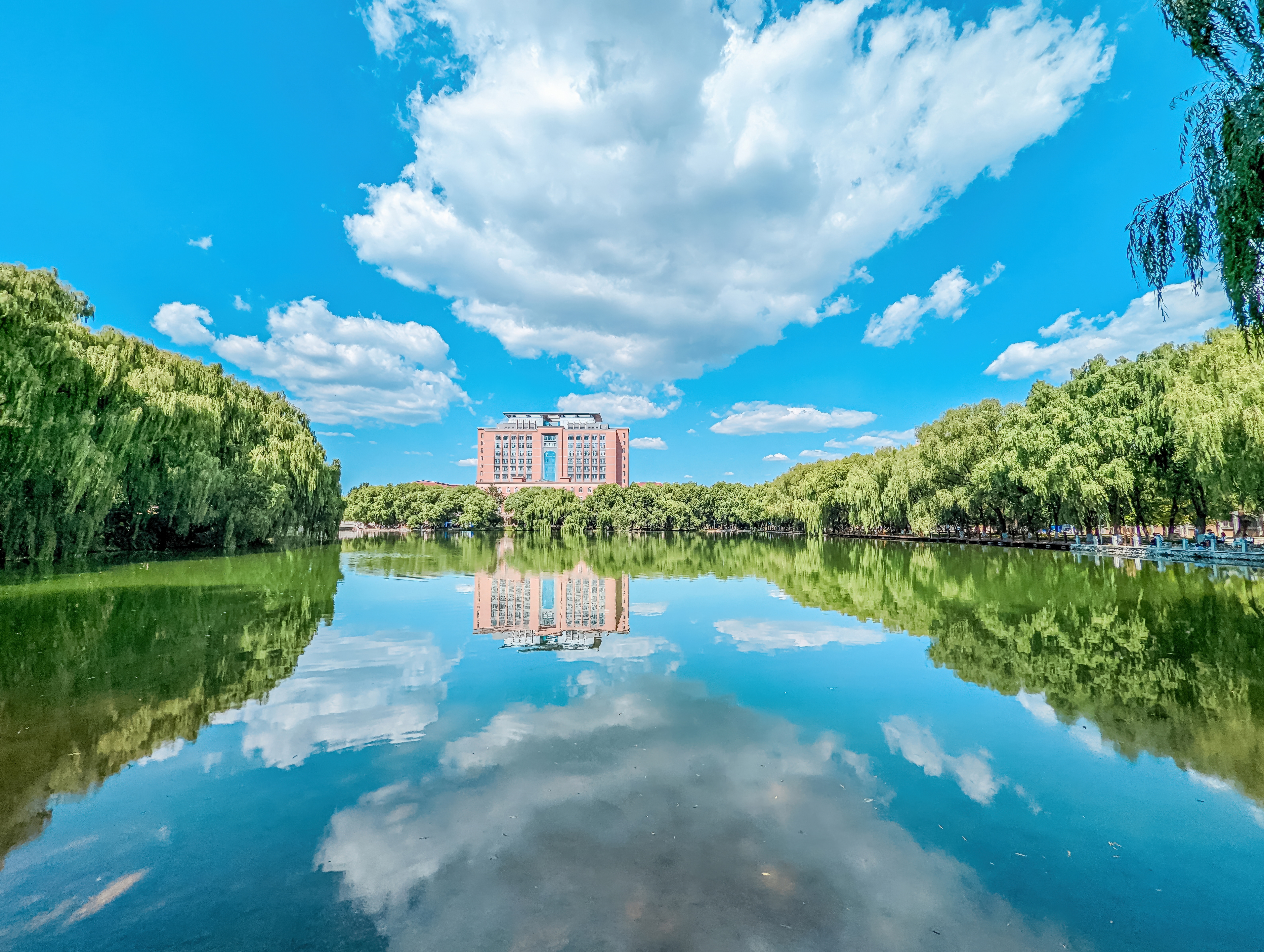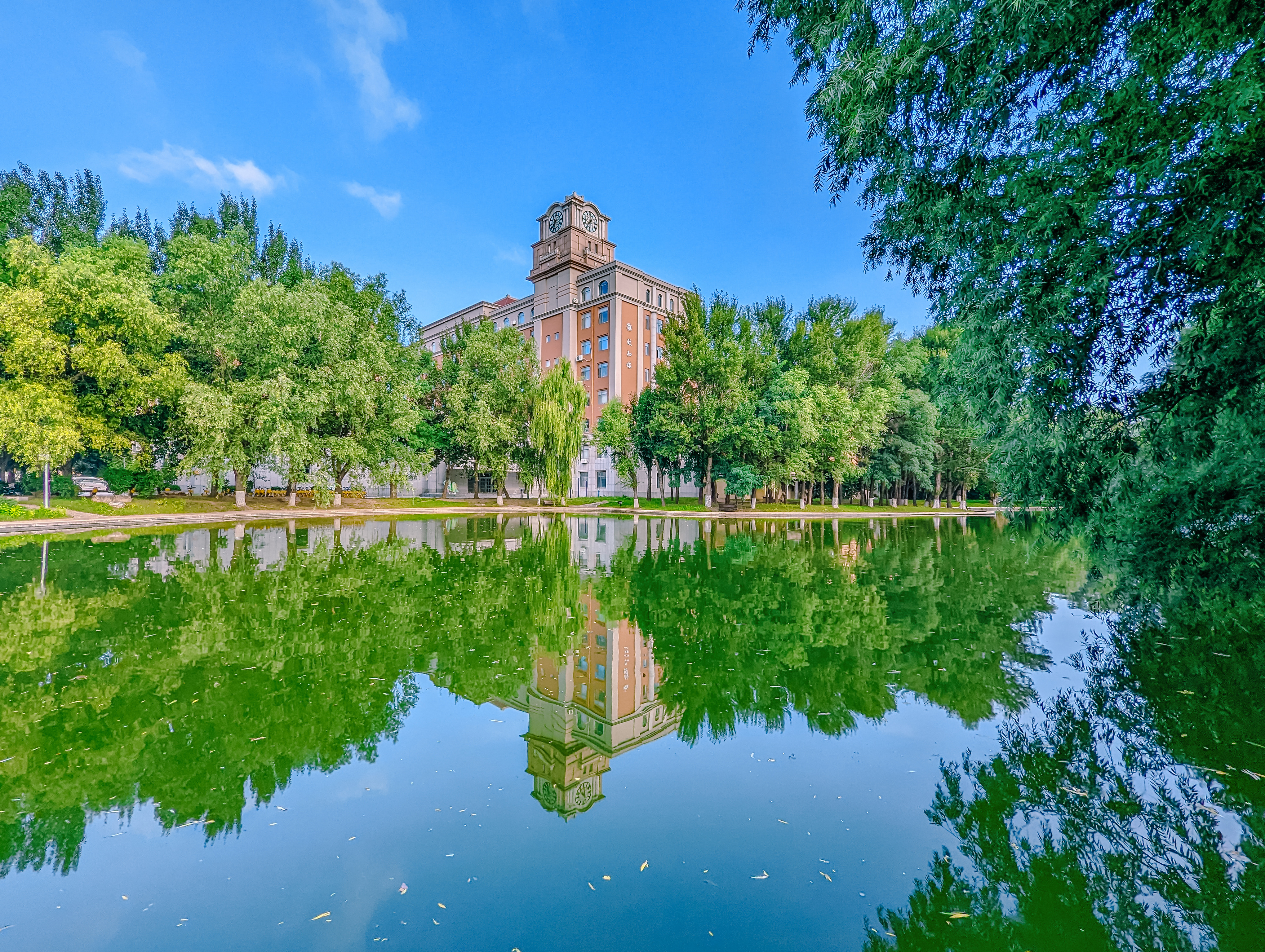 渤海大学の秋のキャンパスは絵のように美しく、湖の水は澄み切り、蓮の葉が広がる。建築物と緑が調和を成し、静寂と美しさが共存する風景が広がっている。