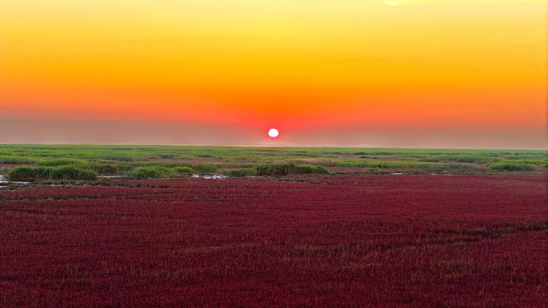 選定理由:秋の紅海滩は絶頂の美しさを迎え、スアエダ(碱蓬草)は淡い赤からワイン色へと変わり、果てしない「赤い絨毯」を敷き詰める。夕陽が赤い灘に暖かな金色の光暈を施し、さらに「鳥の群れと夕陽」という奇観に出会えるチャンスもある。数万の渡り鳥の群れが飛び交い、夕陽と共に舞い、湿地の塩辛い風と光と影が織り成す、唯一無二の海岸日落の壮観を作り出す。
