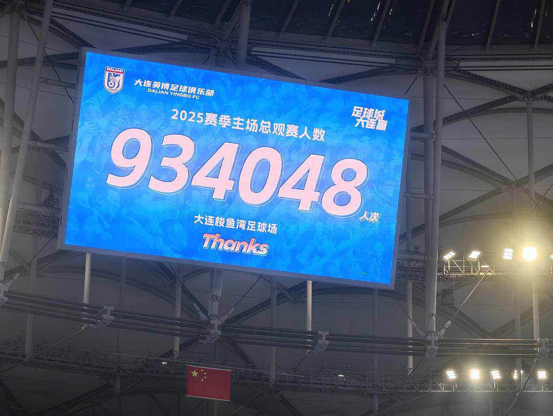 この日、2025シーズン中国サッカー・スーパーリーグ最終戦において、大連英博海発は上海海港との頂上対決を迎えた。この一戦には62,330人のサポーターが梭魚湾足球場に詰めかけ、チームを熱烈に応援した。この数字は大連英博海発のホームゲーム観客動員記録を更新しただけでなく、2025シーズンのホームゲーム総観客動員数を934,048人とし、世界ランキング17位に躍進させた。ホームゲームの1試合平均観客数は57,978人に達し、アジア首位となっている。
