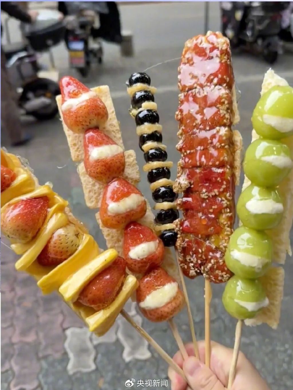 「ナイピーズ・タンフールー」という名で売られている糖葫蘆で最もよく見られるのは、従来の糖葫蘆に奶皮子が添えられて、飴がけになっているタイプだ。また半分に切り込みを入れたサンザシに奶皮子を挟んでいるタイプ、さらにはサンザシの代わりにシャインマスカットやイチゴ、イチジクやジャックフルーツ(パラミツ)、ドリアンを使い、それらでヨーグルトを挟み、最後に奶皮子を添えるという斬新なタイプもあり、ネット上で人気の食材がほぼ勢揃いしている。