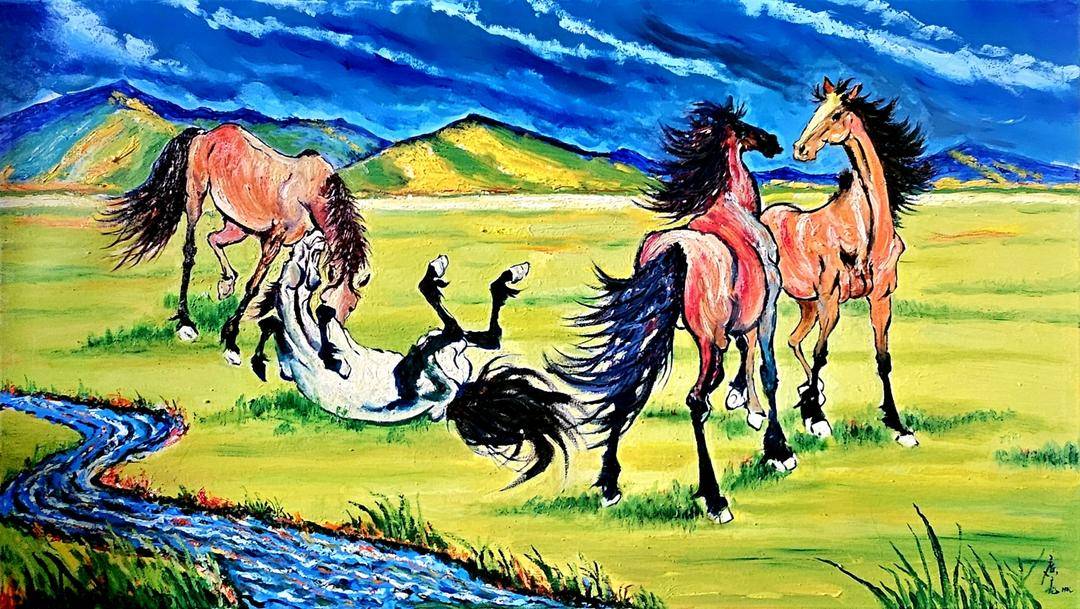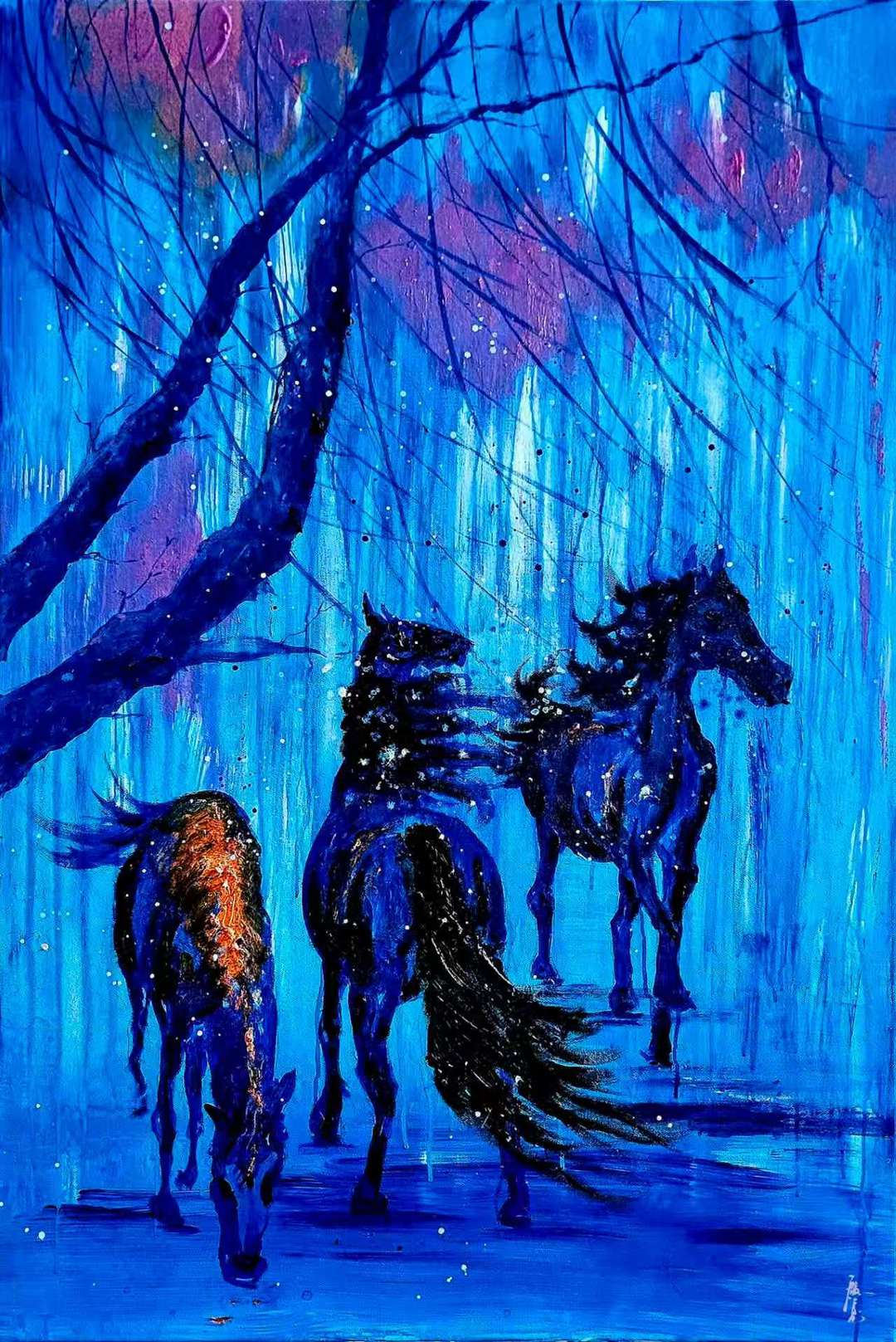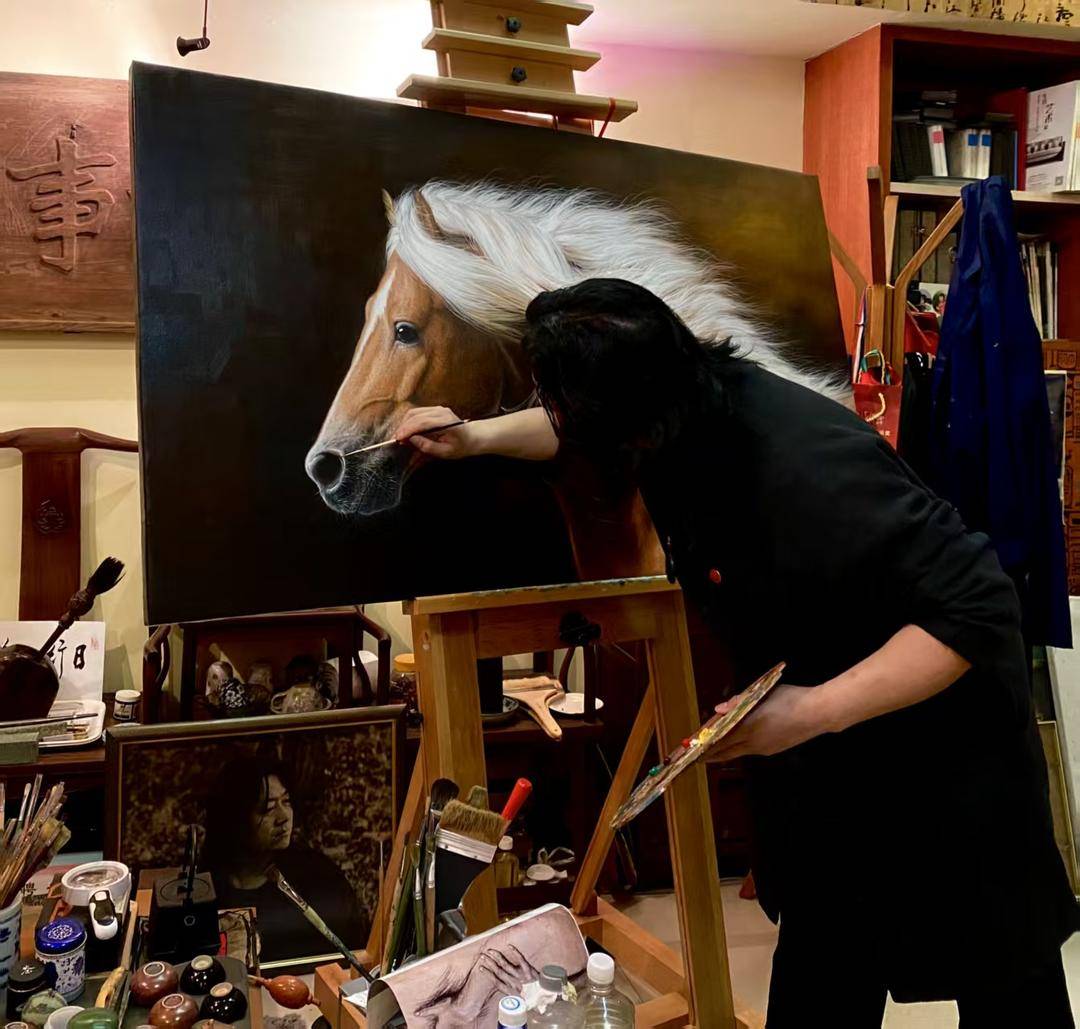 黄広亮は瀋陽を拠点とする著名な画家だ。数十年にわたり油絵の創作に専念し、特に馬を描くことで美術界で名を知られている。今回展示される40点以上の作品には、「馬、的盧のごとく飛ぶ」ような爽快さもあれば、「鉄馬秋風大散関」の壮大な激情もあり、「晩春、盤馬して青苔を踏む」のような閑雅な趣や、「嘶く馬、門を出でて旧郷を思う」の離愁も見られる。どの絵画も単なる馬の肖像ではなく、一種の情感の表現と芸術の探求である。黄広亮の作品は、馬の力と優雅さを感じさせるだけでなく、人と自然の関係について考えさせ、観客の心に生命と自由への憧れを呼び起こす。
