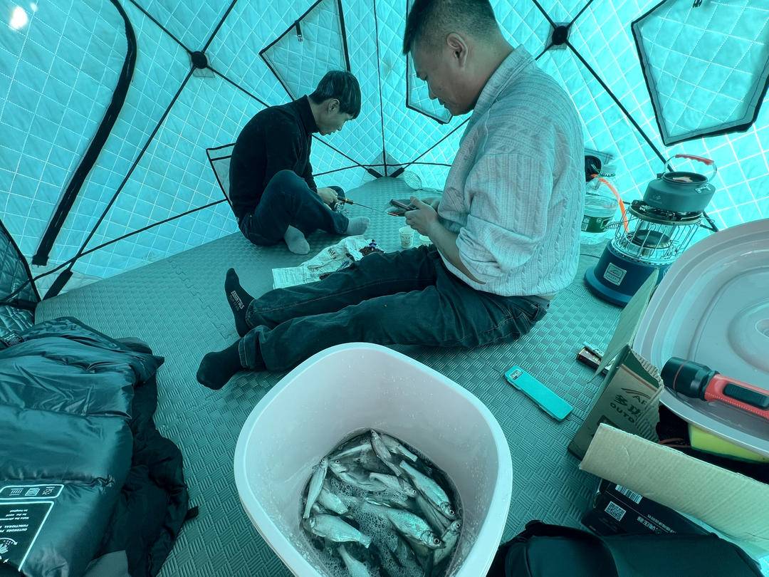 「釣り開始!」という鋭く響く合図とともに、すでに準備を整えていた釣り人たちはそれぞれの釣りポイントへ向かい、色鮮やかなテーマ別氷釣りテントの中へ。彼らは慣れた手つきで釣具を点検し、浮き釣りの仕掛けを調整し、氷穴の下の水域をしっかりと見据えて、静かに魚がかかるのを待ち構えた。