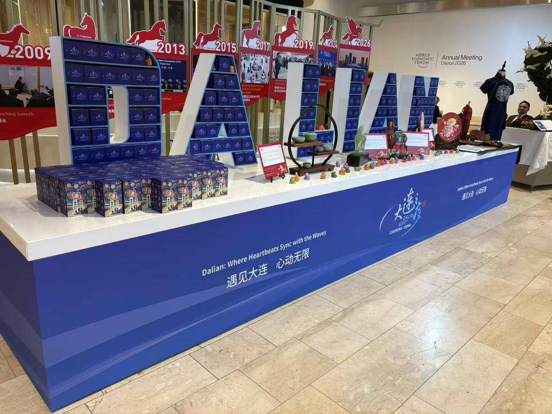 今回の「大連の夜」は「躍進する馬が山海を結び、福が新たな章を開いて世界と出会う」をテーマとし、「三步ごとに一つの景観がある」没入型シーンを創出。赤と金のメインカラーが新年の雰囲気を演出し、青と白のサブカラーは大連の海洋特性とダボスの雪氷文化を表現した。中核展示エリアでは、遼南地方の麵塑(小麦粉細工)で作られた十二支のガチャガチャが「DALIAN」の文字を形作り、遼寧岫岩玉、大連貝細工、竜泉青磁、香雲紗(シルク生地)の手作りチャイナドレスなど、代表性のある無形文化遺産作品が中国伝統文化の内包を集中的に展示した。特別にデザインされた駿馬のシルエットの中には「ダボスと大連の共催の歩み」が展示され、9枚の写真がダボスと大連の8度の「連携」と、将来に向けたさらなる協力深化のビジョンをそれぞれ象徴している。