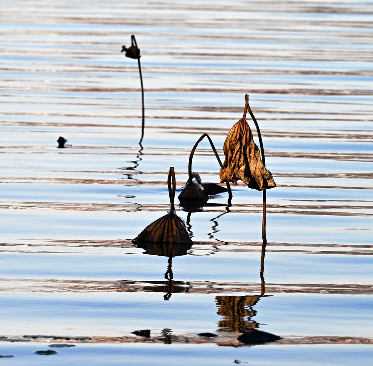 In early winter, the lotus in the pond of Dingxiang Lake Park in Shenyang has withered, but the hanging leaves and stems are still swaying melancholy under the sunshine, holding onto the final hope. The withered lotus floating on the water reminds visitors of much precious memory, but this is nothing more than a farewell to the autumn. When the spring breeze comes and the lotus sprouts, the pond will be filled with vitality once again.