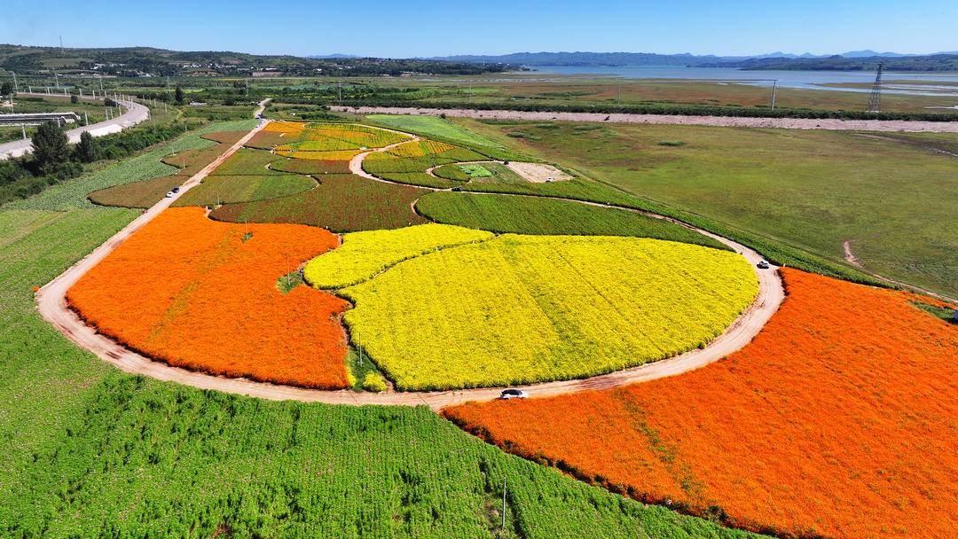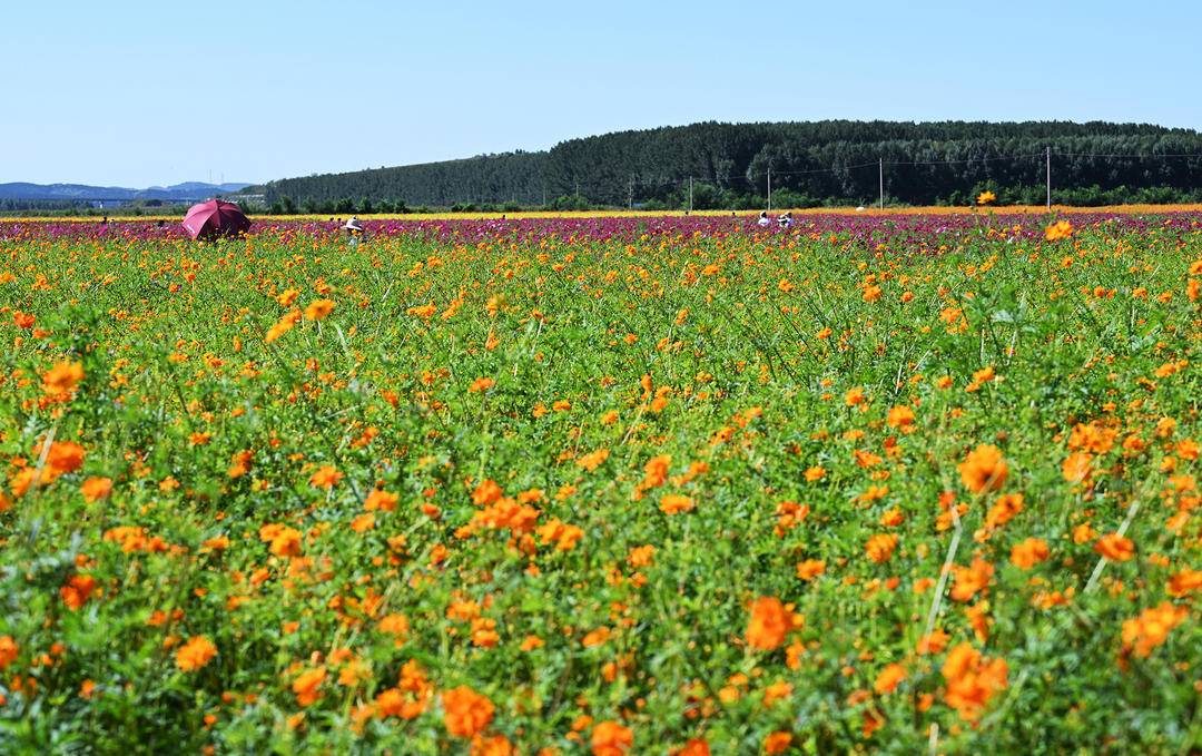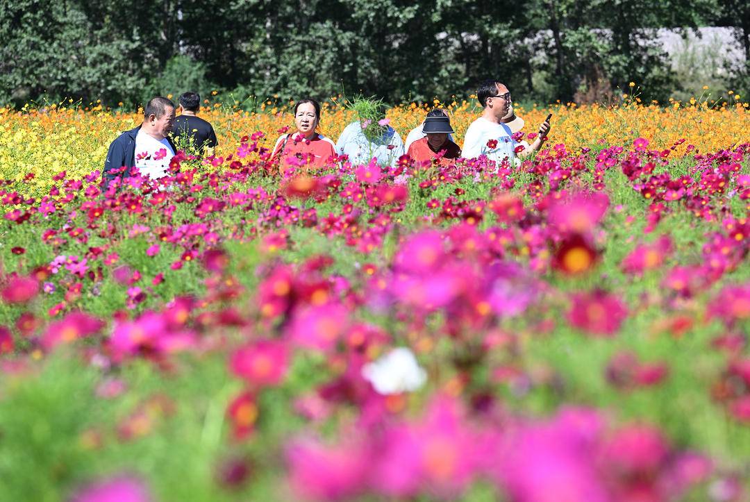 In Beipiao County-level City, Liaoning Province, a vast sea of flowers shimmers with shades of silver-yellow, orange-yellow, pink, and purplish-red. Tourists, delighted by the floral spectacle, eagerly capture its beauty with their cameras.