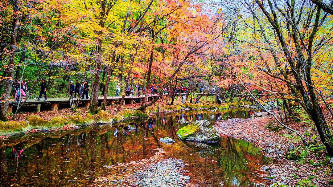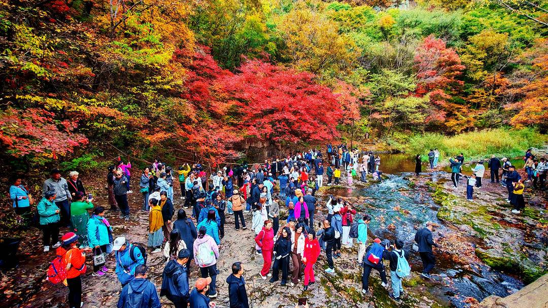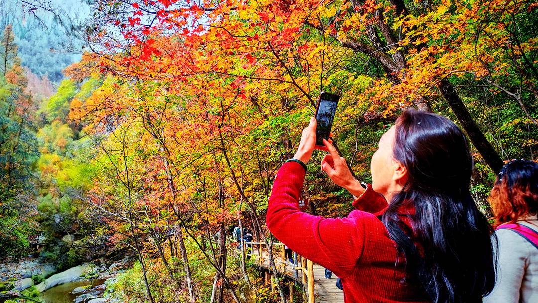 The mountainsides of Guanmen Mountain in Benxi City, Liaoning Province are adorned with crimson autumn leaves that gleam brilliantly under the sun. Sunlight pierces through the gaps between branches and leaves, casting dappled spots of light on the ground. Beneath the feet, fallen leaves create a soft “red carpet,” and each step is accompanied by the gentle rustling whispers of autumn.