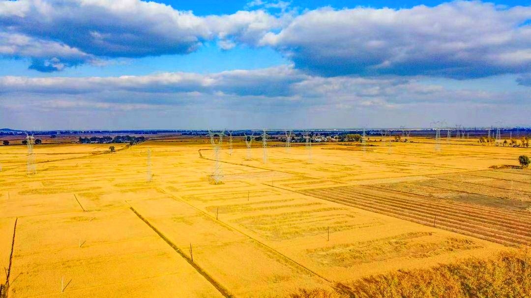 The fields in Shenbei New District of Shenyang City, Liaoning Province are covered in a golden hue. The golden waves of rice and the villages in the distance add radiance and beauty to each other, forming a magnificent autumn harvest scene.