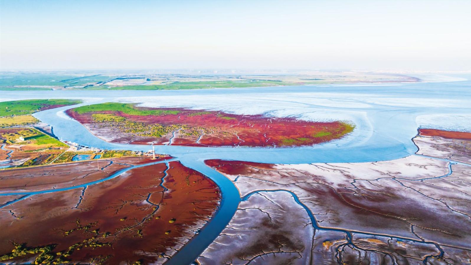 At the Liaohe River Estuary in Panjin City, Liaoning Province, the crimson suaeda salsa stretches endlessly, like a red carpet meticulously woven by nature. The golden rice paddies, the swaying reeds, and the red beach together paint a vibrant natural landscape.