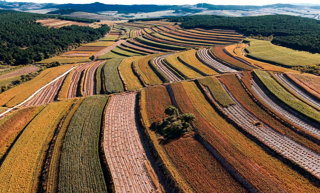 On the vast fields in Jianping County, Liaoning Province, tens of thousands of mu of miscellaneous grains have been harvested and stored. The fertile land stretches endlessly beneath a clear sky, with drifting clouds enhancing the stunning landscape.