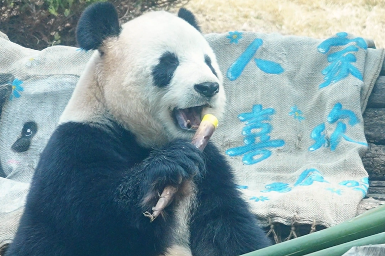 Look! This giant panda is taking a bite of a special cooked steamed corn bun, chewing it slowly and savoring every mouthful of this delicious treat.