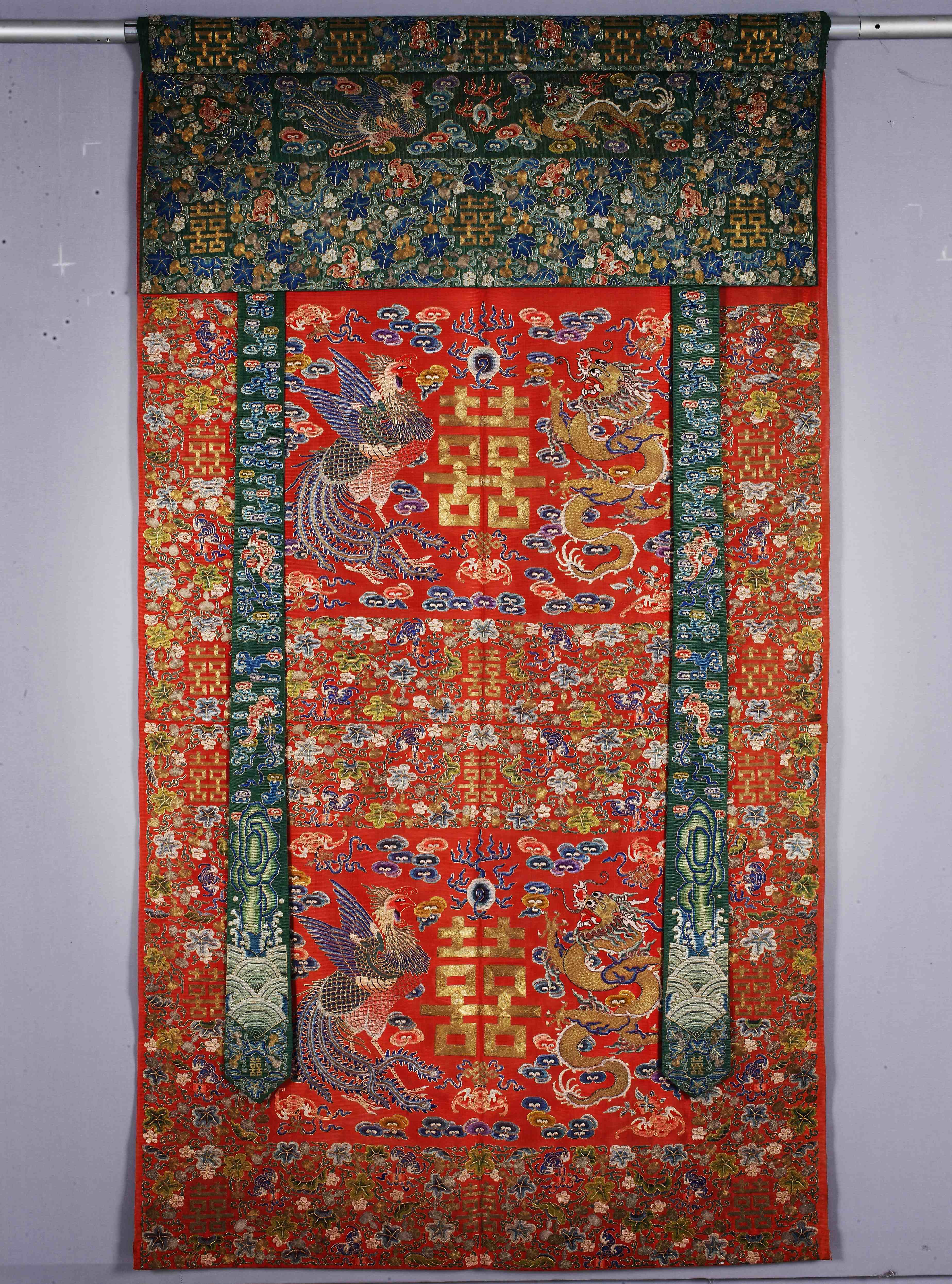 A large embroidered piece in this exhibition drew many visitors to stop and admire it. This embroidered wedding curtain, with the patterns of dragons and phoenixes symbolizing double happiness, is a national first-class cultural relic, and a representative work of the Qing Dynasty (1644-1911) counted thread embroidery. This embroidered piece is also known as “Plywood Curtain”, because hardwood plywood can be fitted between the sections of the embroidered patterns. The utilization of the special weaving technique, where the weft threads are thicker than the warp threads, imparted a firm and smooth texture to this embroidery. On the bright red fabric, female embroiderers from the Qing Dynasty applied various embroidery techniques, such as satin stitch, and knot stitch. The central part of the curtain features the patterns of dragons and phoenixes and “double happiness” symbols, with auspicious clouds as the background. Within each pair of dragon and phoenix, the patterns of five bats are distributed in the four corners and below each large “double happiness” symbol. Moreover, the surrounding area is adorned with patterns of gourd vines. These traditional embroidered patterns carry ancient Chinese people’s aspirations for a blissful marriage with prosperous offspring.
