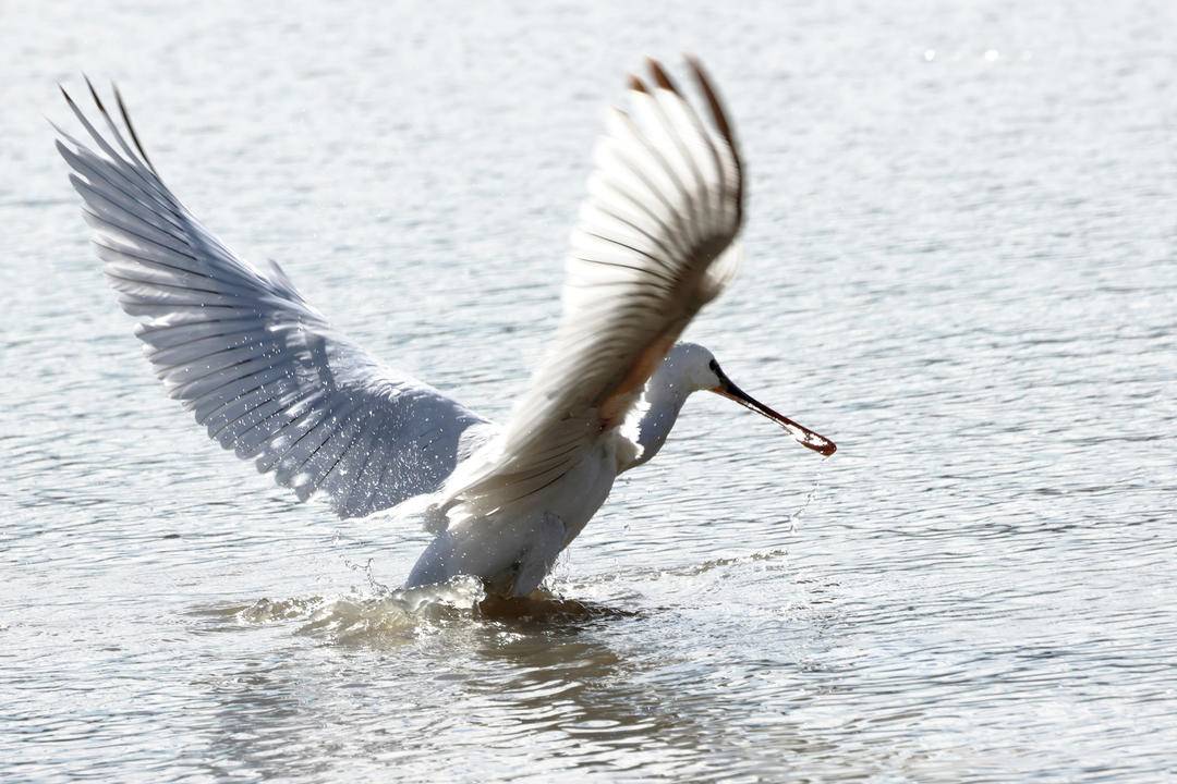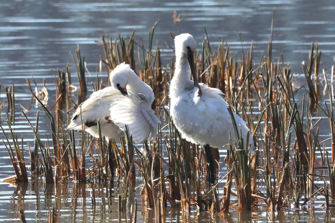 The rare white spoonbills, with their snow-white plumage and distinctive spoon-shaped bills, are a striking sight along the Daling River in Liaoning Province. This unique ecological scene has drawn numerous photographers to capture these stunning moments.
