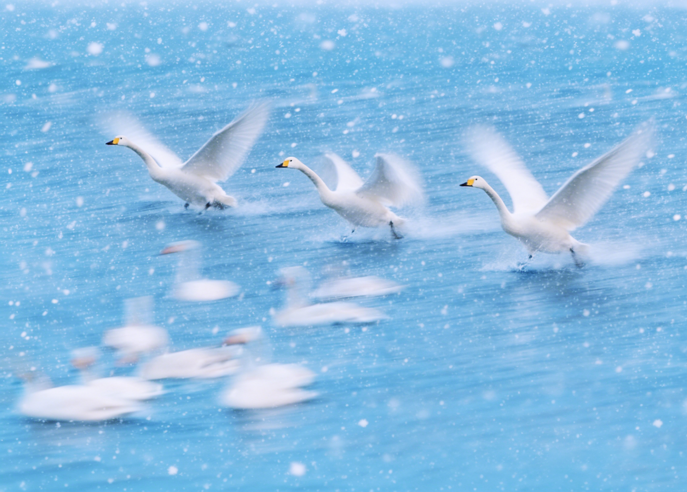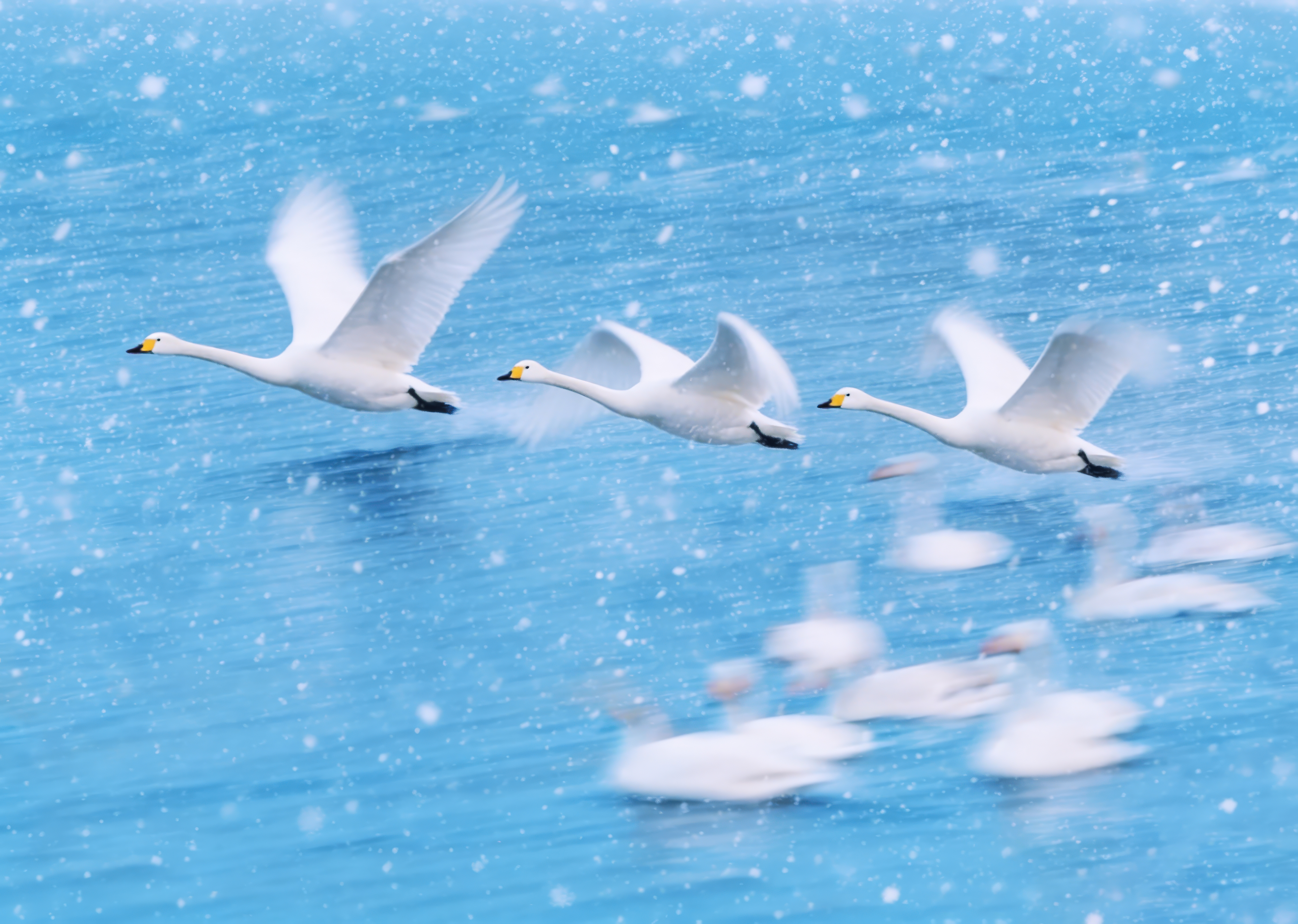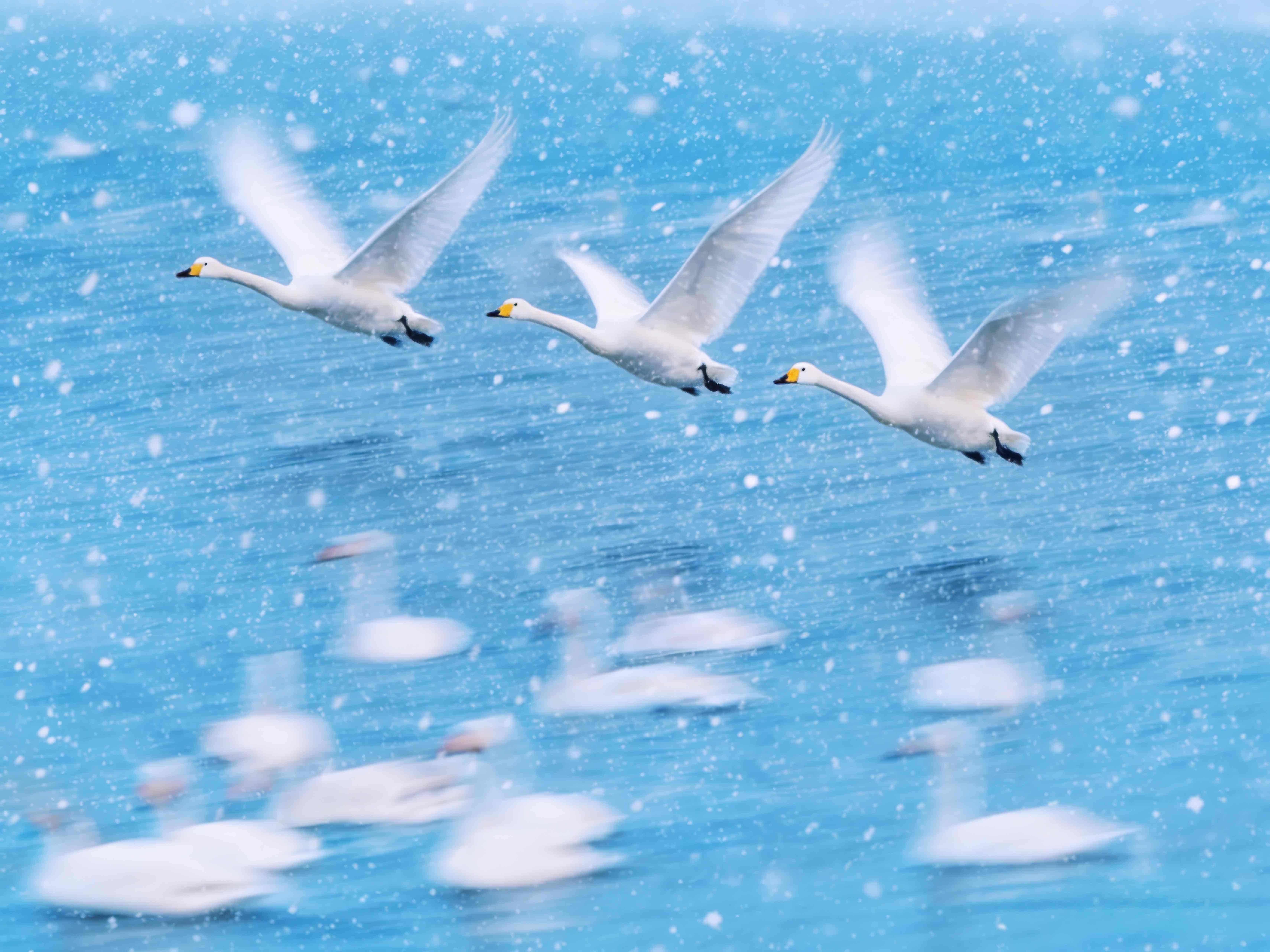 On the waters of Jinzhou Nyu’er River, three swans spread their wings and take flight. Swirling snowflakes, white feathers, and blue water blend into stunning snowy scenery.