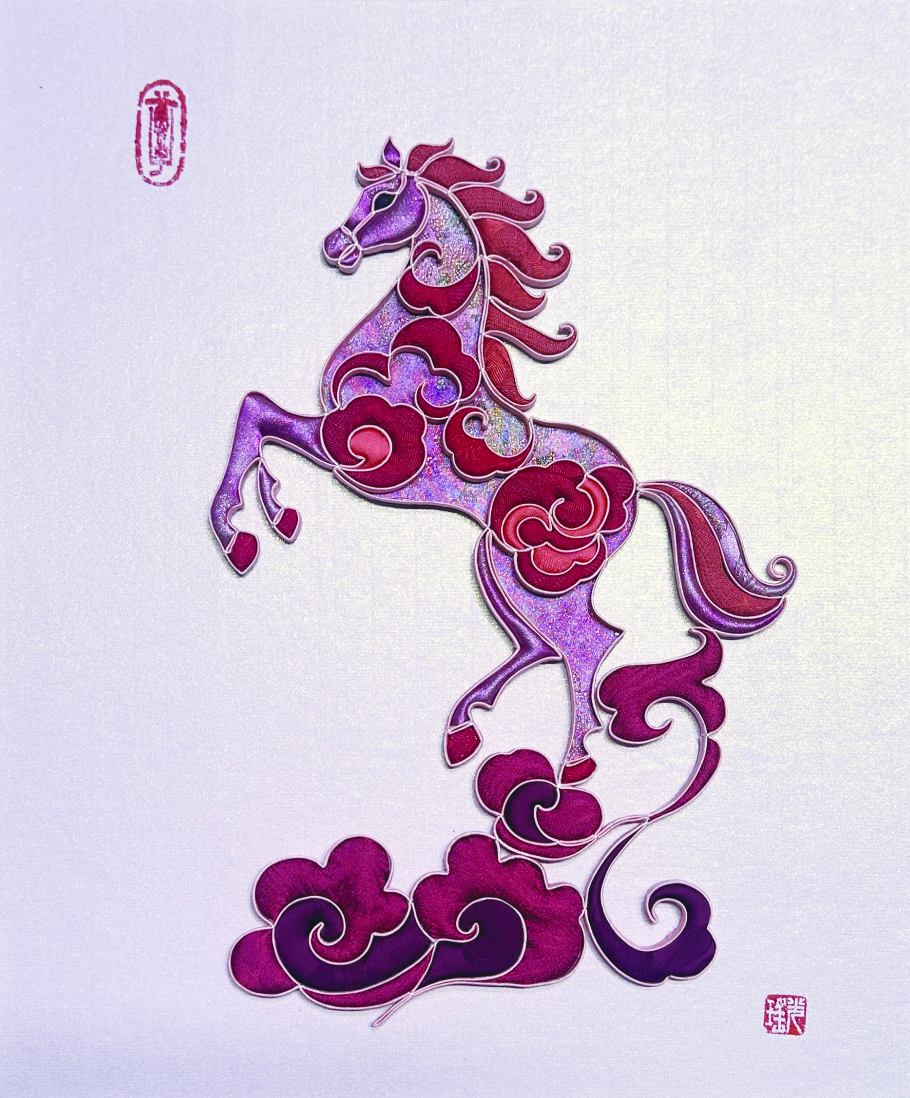 This is a pankou (traditional Chinese knotted button) themed “Crimson Steed Galloping Through Auspicious Clouds”. The artisan intricately fashioned a galloping horse into the pankou, with every detail like muscles, flowing mane, and clouds being brought to life.