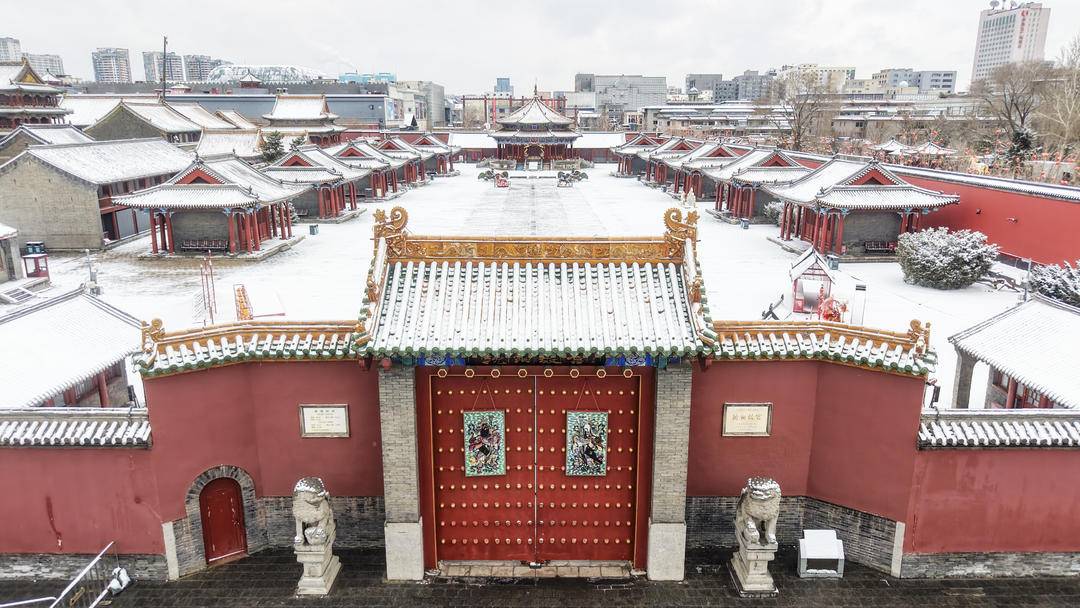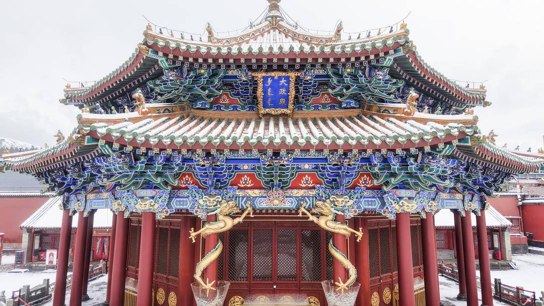 A spring snow falls on the Shenyang Imperial Palace in Liaoning Province, draping the ancient complex in a pristine white coat. The crimson walls and golden tiles create a breathtaking contrast against the pure snow, forming a serene visual feast.