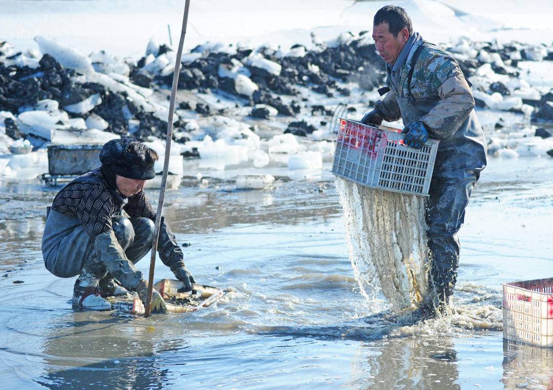 이 작업은 쉼 없이 허리를 구부리고 팔을 움직여야 하는 고된 육체노동이다. 예전에는 남성 중심의 일자리였지만, 이제는 여성 채취인들도 많아져 남편과 함께 갯벌에 나서는 모습을 쉽게 볼 수 있다. 일이 끝날 무렵이면 갯벌은 북적거리며, 중국 동북 지방 특유의 정겨운 사투리가 추운 공기를 채운다.