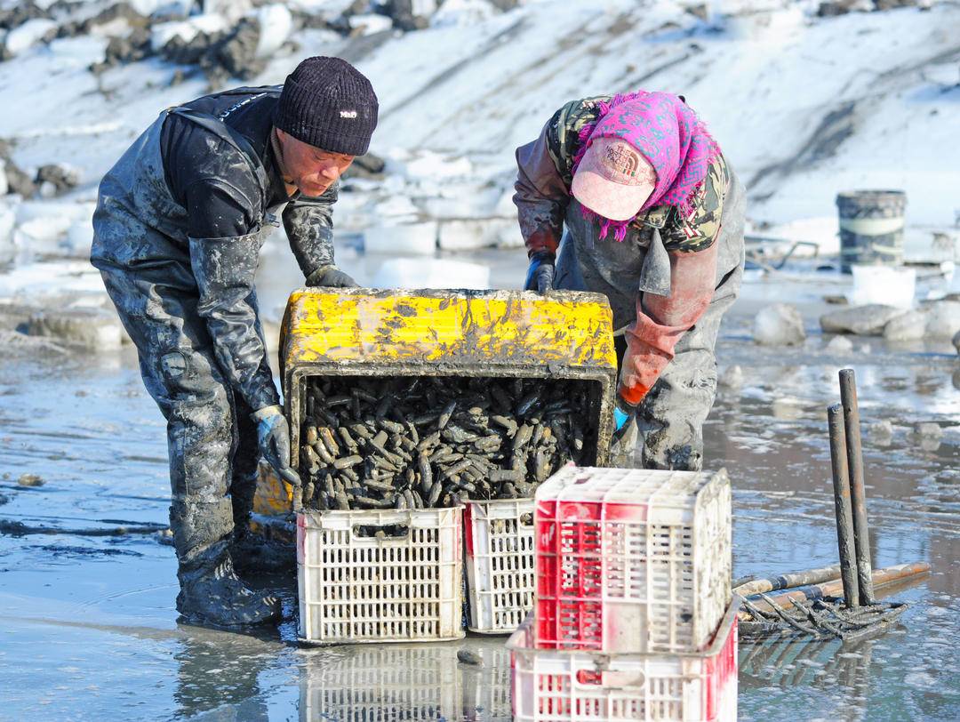 둥강과 좡허 해안 갯벌에서 인공 양식된 맛조개는 맛이 뛰어나기로 유명하다. 채취인들은 농한기를 이용해 이 일을 시작하며, 추운 계절을 알차게 보낸다. 두꺼운 솜옷을 껴입은 채취인들은 혹한을 뚫고 괭이로 단단한 해빙을 찍어 내고, 강철 써레로 진흙을 헤집으며 맛조개를 찾는다.
