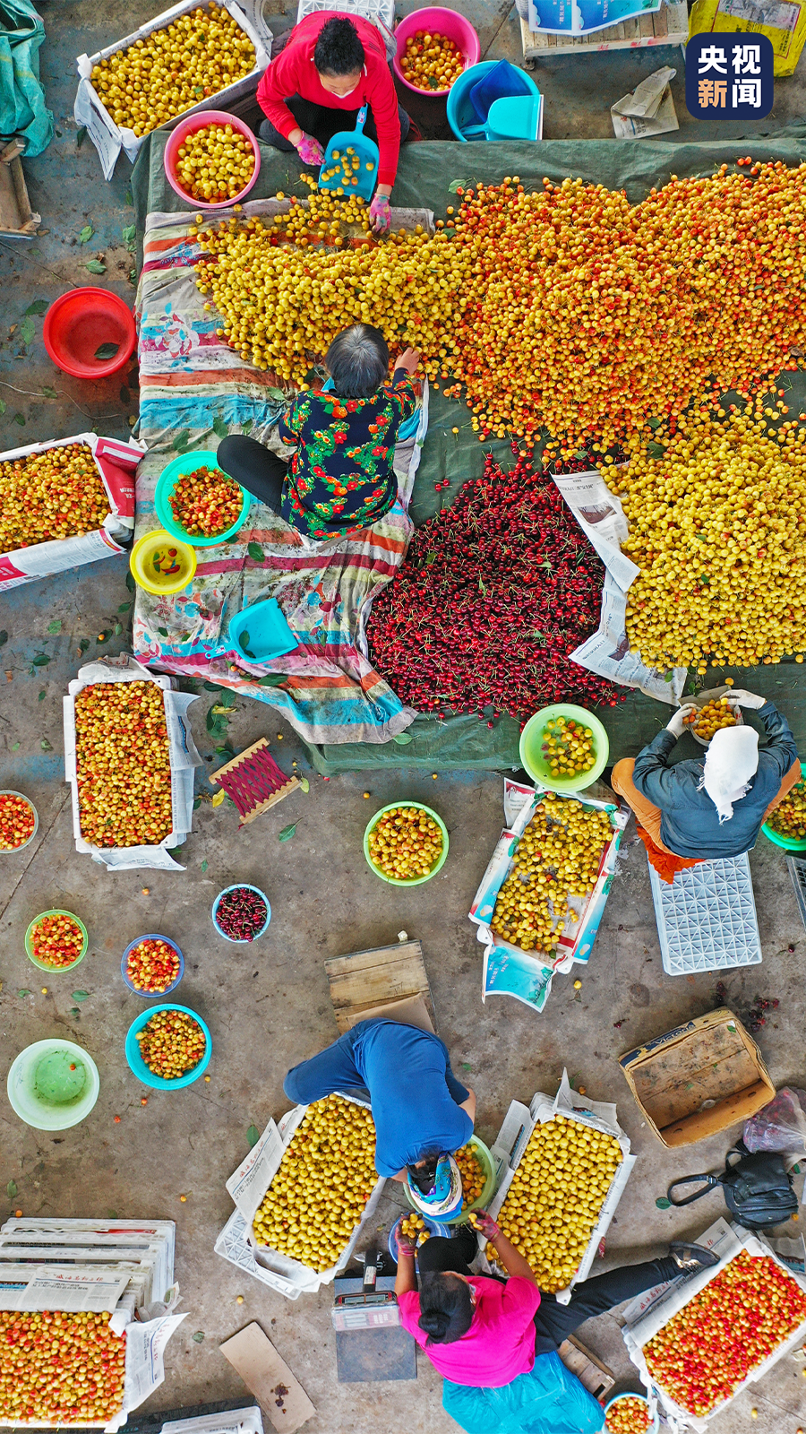 樱桃批发市场内,果农在销售樱桃。