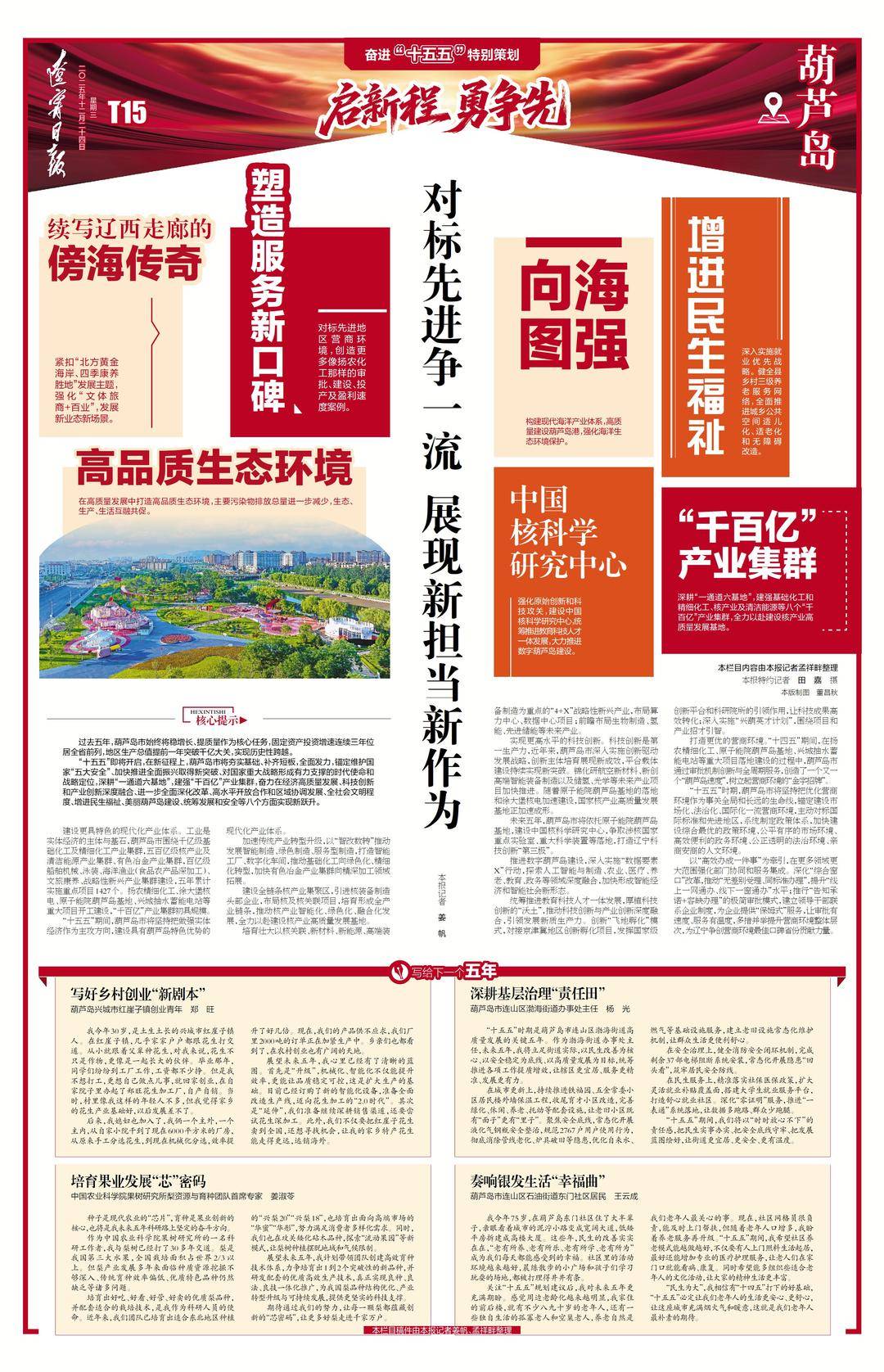 “十五五”即将开启,在新征程上,葫芦岛市将夯实基础、补齐短板,全面发力,锚定维护国家“五大安全”、加快推进全面振兴取得新突破、对国家重大战略形成有力支撑的时代使命和战略定位,深耕“一通道六基地”,建强“千百亿”产业集群,奋力在经济高质量发展、科技创新和产业创新深度融合、进一步全面深化改革、高水平开放合作和区域协调发展、全社会文明程度、增进民生福祉、美丽葫芦岛建设、统筹发展和安全等八个方面实现新跃升。