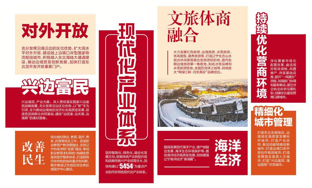 丹东将“十五五”的宏伟目标细化为日复一日的扎实行动。围绕实现“五个新提升”,未来五年将统筹传统产业转型升级和战略性新兴产业培育壮大,加快构建具有丹东特色的现代化产业体系;推动高水平科技创新,因地制宜发展新质生产力;深入实施扩大内需战略,积极服务和深度融入新发展格局;加快构建高水平社会主义市场经济体制,激发全面振兴的内生动力和创新活力;扩大高水平对外开放,加快打造面向东北亚开发开放重要门户;推动海洋经济高质量发展,加快建强辽宁海洋经济“黄海翼”;扎实推进乡村全面振兴,加快农业农村现代化;统筹市域空间协调发展,持续优化区域经济布局;激发文化创新创造活力,推动文旅体商融合发展;在发展中保障和改善民生,推动共同富裕迈出坚实步伐;促进经济社会发展全面绿色转型,加快建设美丽丹东;守住安全发展底线,加快建设高水平平安丹东。