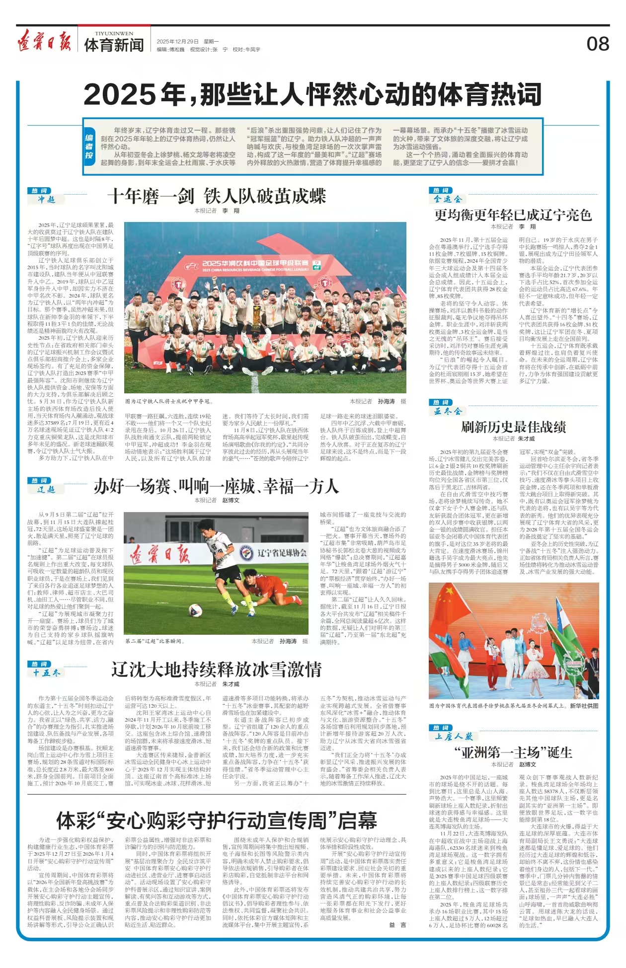 从年初亚冬会上徐梦桃、杨文龙等老将凌空起舞的身影,到年末全运会上杜雨宸、于水庆等“后浪”杀出重围强势问鼎,让人们记住了作为“冠军摇篮”的辽宁。助力铁人队冲超的一声声呐喊与欢庆,与梭鱼湾足球场的一次次掌声雷动,构成了这一年度的“最美和声”。“辽超”赛场内外释放的火热激情,营造了体育提升幸福感的一幕幕场景。而承办“十五冬”播撒了冰雪运动的火种,带来了文体旅的深度交融,将让辽宁成为冰雪运动强省。