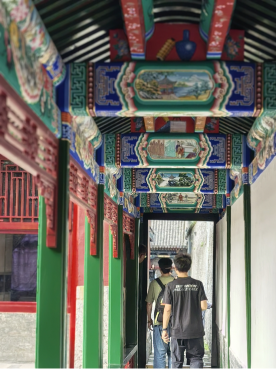 站在保极宫院中,色彩斑斓的抄手游廊布满彩画,尤其抢眼,最为别致,它依东西山墙而建,并与迪光殿相连。抄手游廊将单调的山墙边缘空间柔化,其空间的进深和弹性得到丰富。抄手游廊上的彩画采用江浙一带的“苏式彩绘”技巧来表现,有历史故事,还有山水、花鸟、楼阁,生活气息浓郁,与庄重严肃的东路和中路建筑群形成鲜明对比。