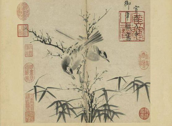朱瞻基《竹树双雀图》。