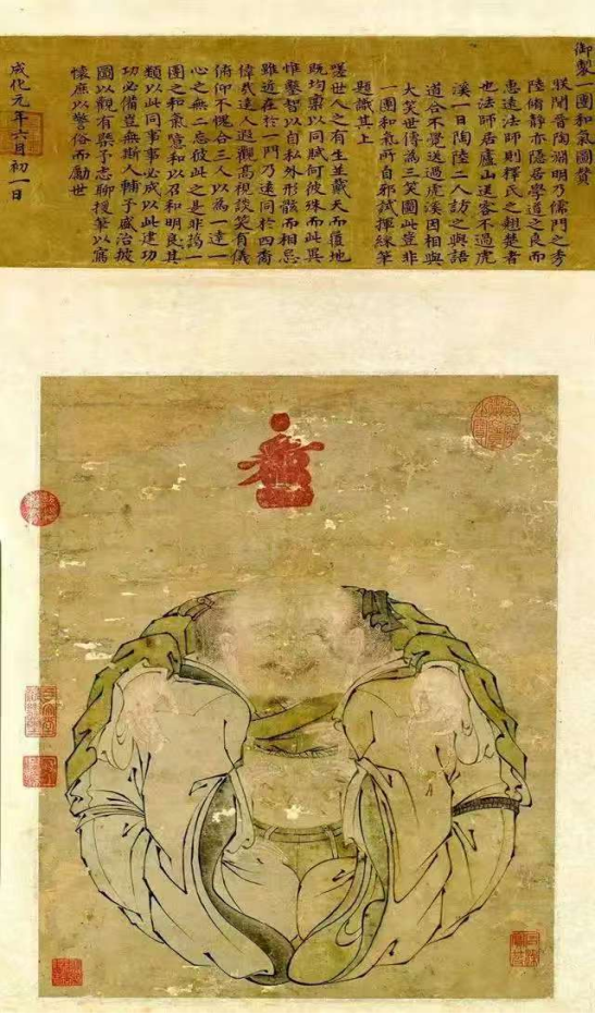 朱见深即位不久,创作了《一团和气图》。该画构思绝妙,人物造型诙谐,线条细劲流畅,显示出纯熟的绘画技艺,表达了对全国上下、朝廷内外安定团结的良苦用心与殷切期待。粗看这幅画,似有一笑面弥勒盘腿而坐,体态浑圆,细看却是三人合一。左为一着道冠的老者,右为一戴方巾的儒士,二人各执经卷一端,团膝相接,相对微笑,第三人则手搭在两人肩上,露出光光的头顶,是佛教中人,生动揭示了儒、释、道“三教合一”的主题思想。