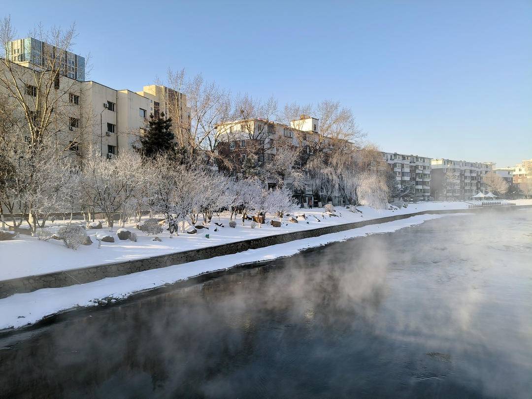 遼寧省瀋陽市の北運河は、暖かな陽射しを受けて、川辺の木々が透き通るような樹氷で覆われ、川面には幾重にも霧が立ち込めている。北運河は樹氷の美しい景色に包まれ、あたかも童話の世界に変貌しているようである。