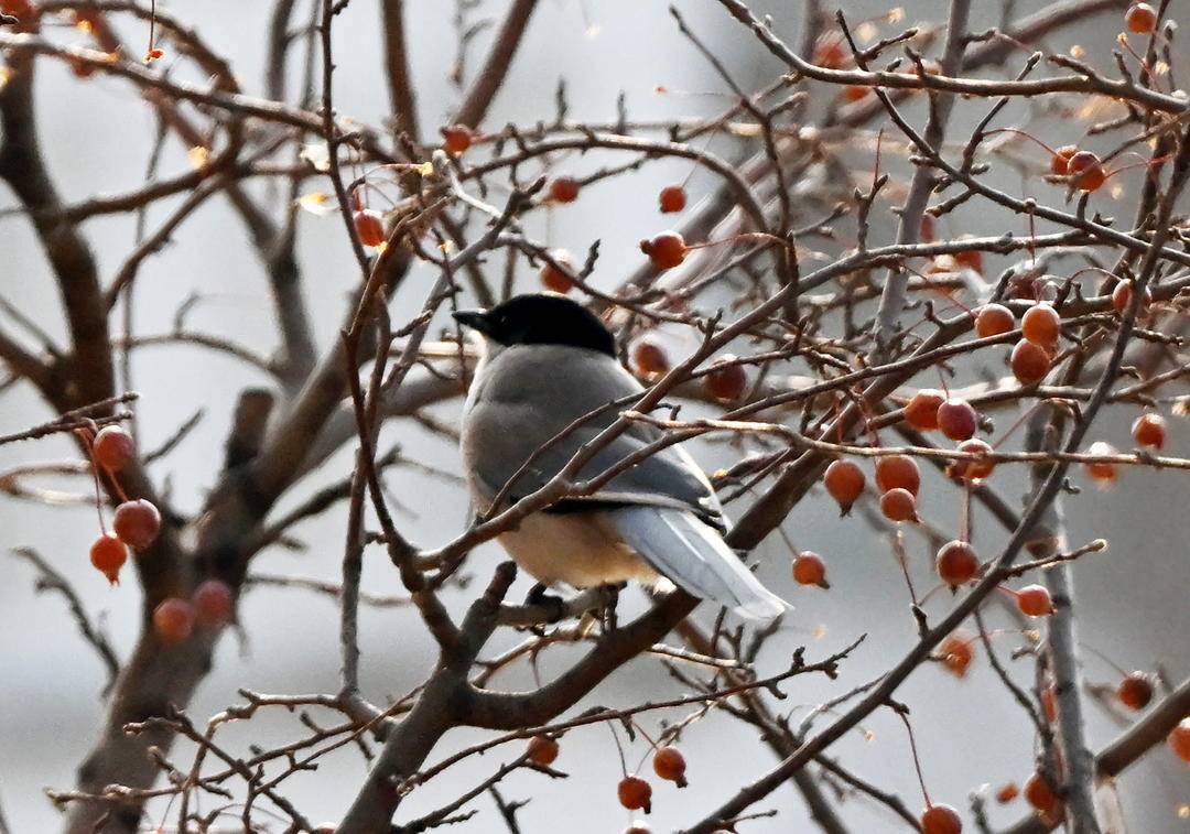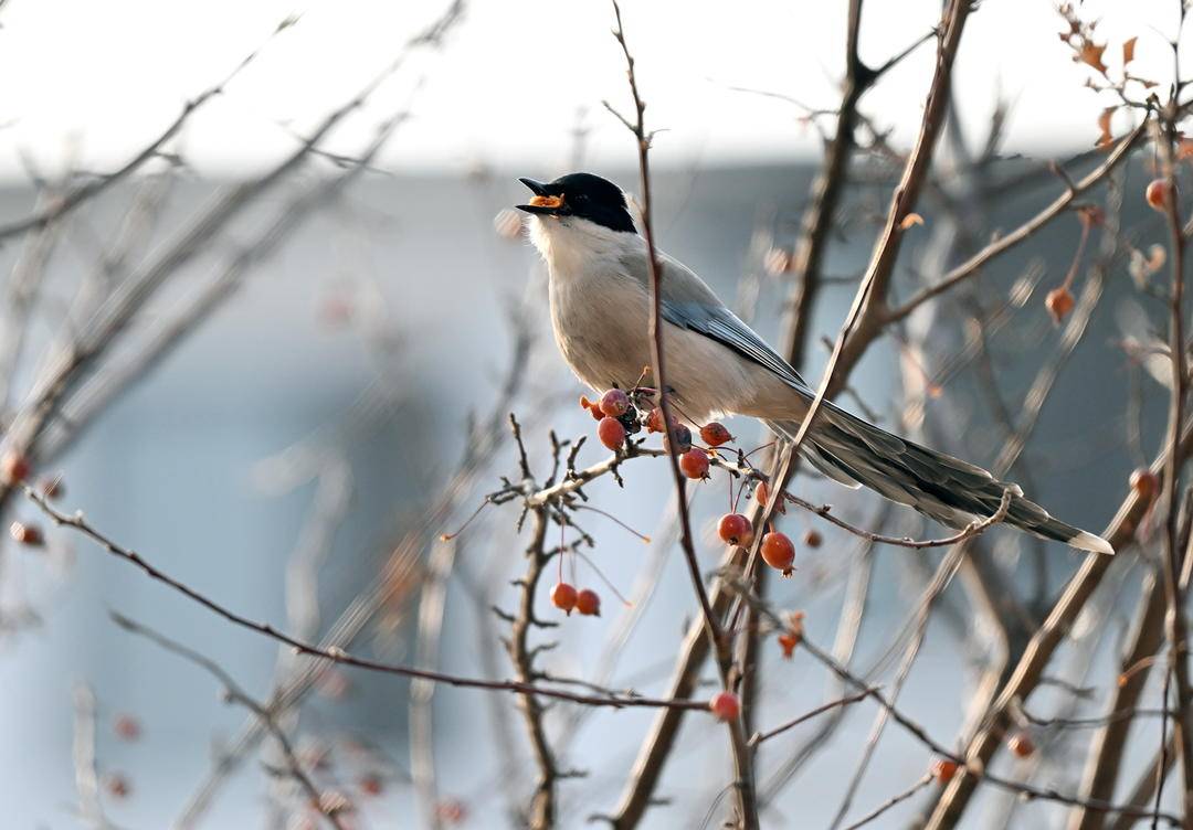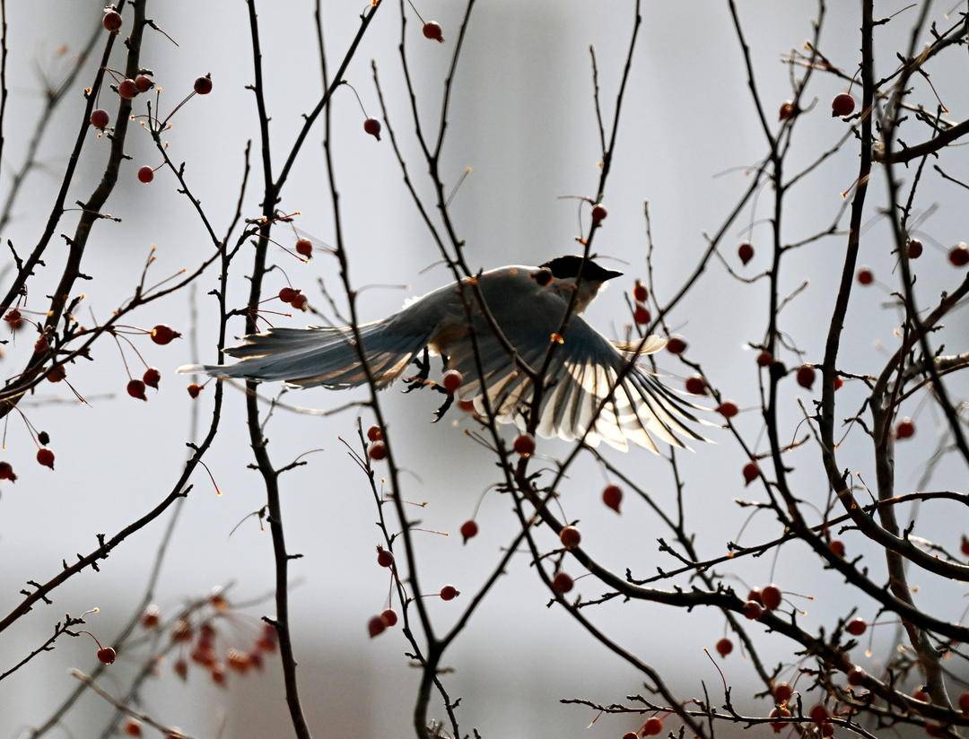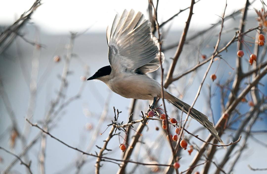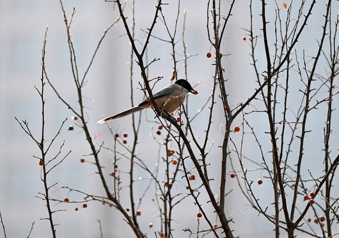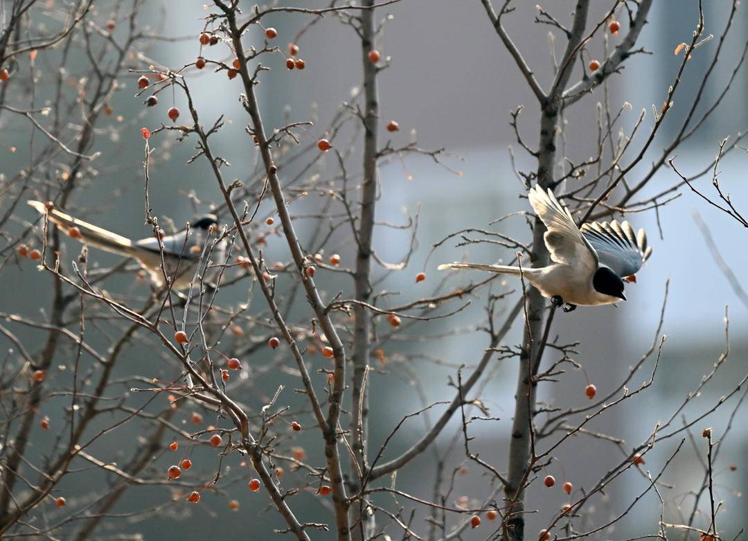 12月16日、瀋陽の北運河のほとりには一面に活気があふれていた。岸辺のカイドウの木には赤い実がたわわに実り、一群のオナガが枝々を飛び交っていた。時には枝に留まって羽づくろいをし、時には赤い実をついばんでは戯れている。