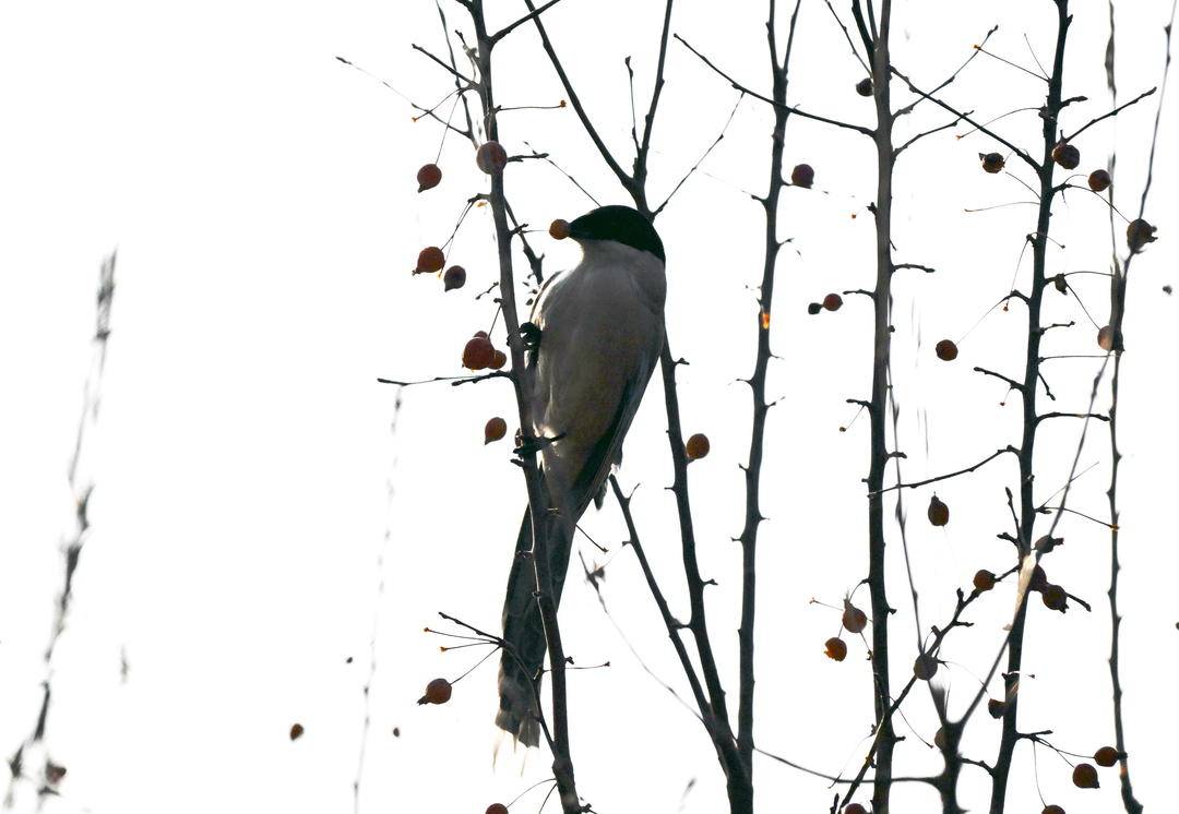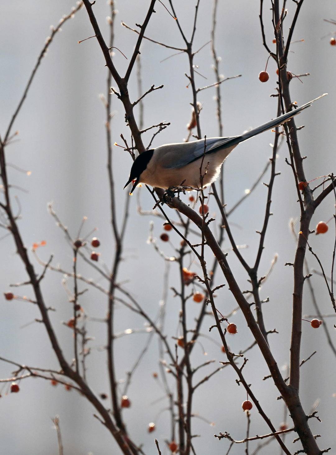 オナガの灰色の羽、鮮やかに赤い実、枯れ黄色の枝が互いに趣を添え合い、もの寂しい冬の北運河に生き生きとした息吹を注ぎ込んでいる。これは河畔の一道の風変わりな風景線ともなり、多くの市民が足を止めて眺め入っていた。