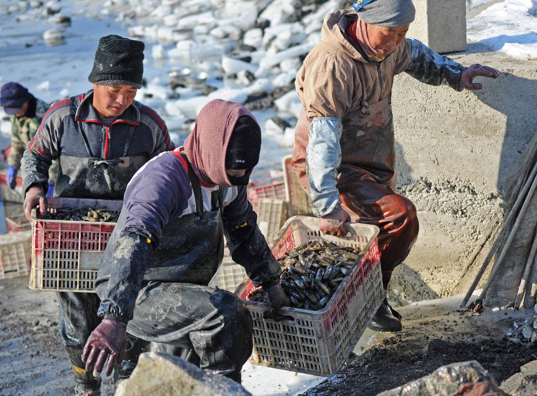 冬の東港と庄河海域の干潟で養殖されるアサリは、最も風味が豊かで美味と言われる。農閑期である冬を利用し、アサリ掘り人たちは氷を割ってアサリを掘り、養殖業者へ販売することで「冬の閑散期を繁忙期に変える」のだ。彼らは厚手の綿入れを身にまとい、厳寒の中、まずはつるはしで硬く凍った海氷を砕き、続いて鋼製の熊手で泥をかき分けアサリを探す。