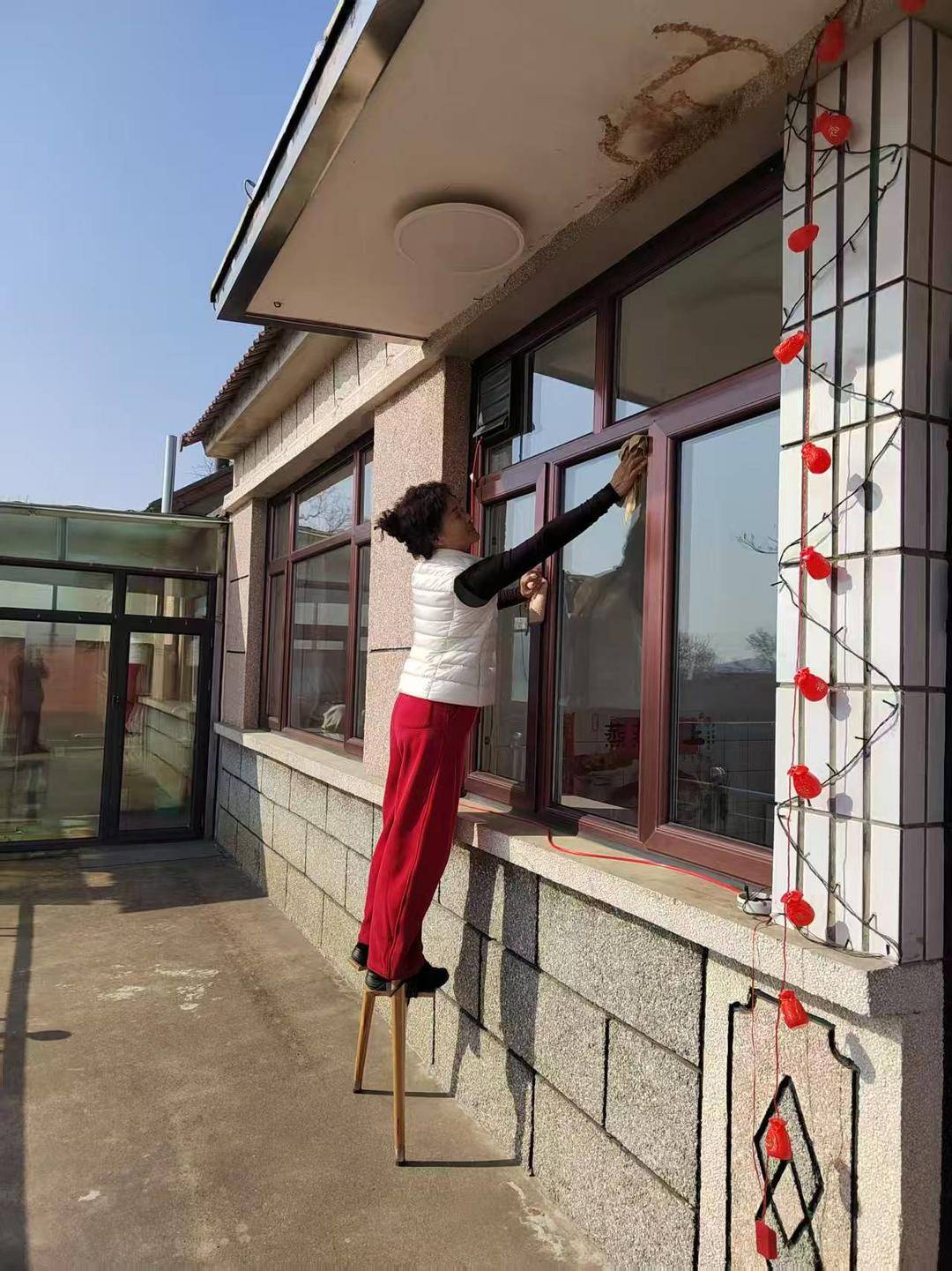 春節が近づき、各家では新年を迎えるための大掃除が行われるが、高い位置の窓拭きは常に難題となる。大連荘河市の石灰窯村では、住民の李淑玲(リ・シューリン)さんが一つの「特技」でこの問題を軽々と解決している――50センチの竹馬に乗って窓を拭くのだ。その様子は鮮やかで手際が良く、新春を彩る話題となっている。