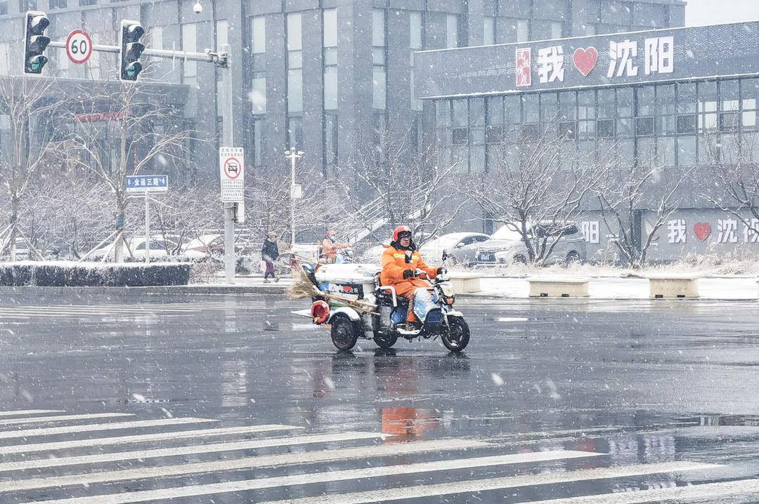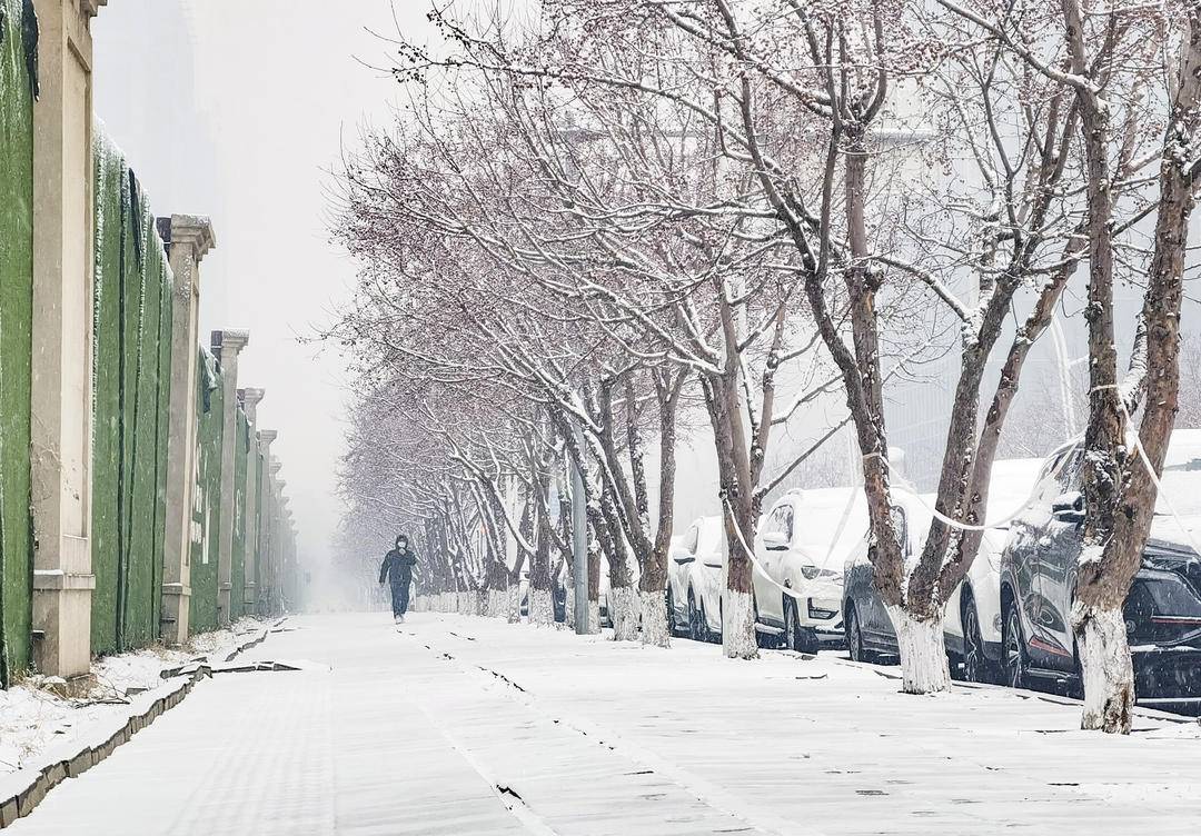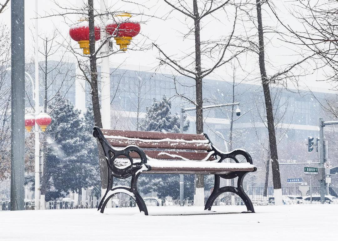 雪は音もなく降り積もり、街は薄化粧を施したかのように白く染まった。ビルの屋根はうっすらと雪化粧し、枝先には宝石のような雪が宿る。街全体が純白に包まれ、ほのかな詩情を漂わせ、まるで薄墨で描かれた山水画のごとき風情を醸し出している。春の訪れを告げる瑞雪が、瀋陽ならではの味わいを深めている。