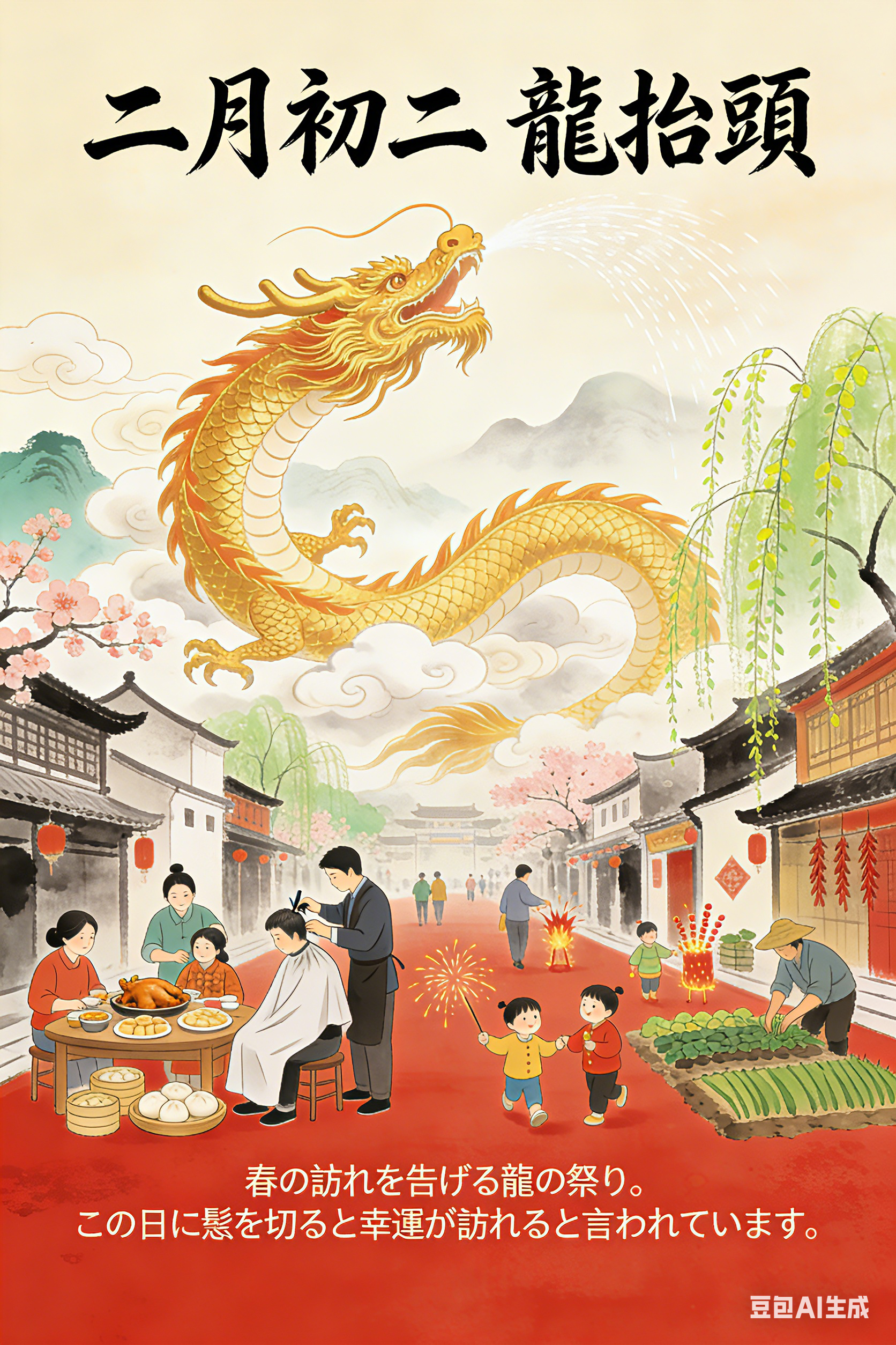 中国の伝統文化において、旧暦2月2日は「龍抬頭(ロンタイトウ)」と呼ばれる特別な日です。冬の間眠っていた龍が目覚め、空へと頭をもたげ、雨を降らせて大地を潤す——つまり、春の本格的な訪れを意味します。