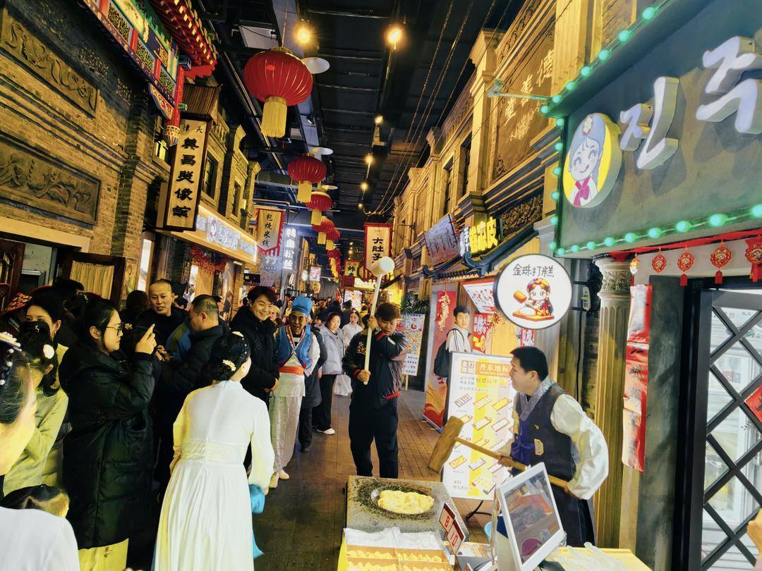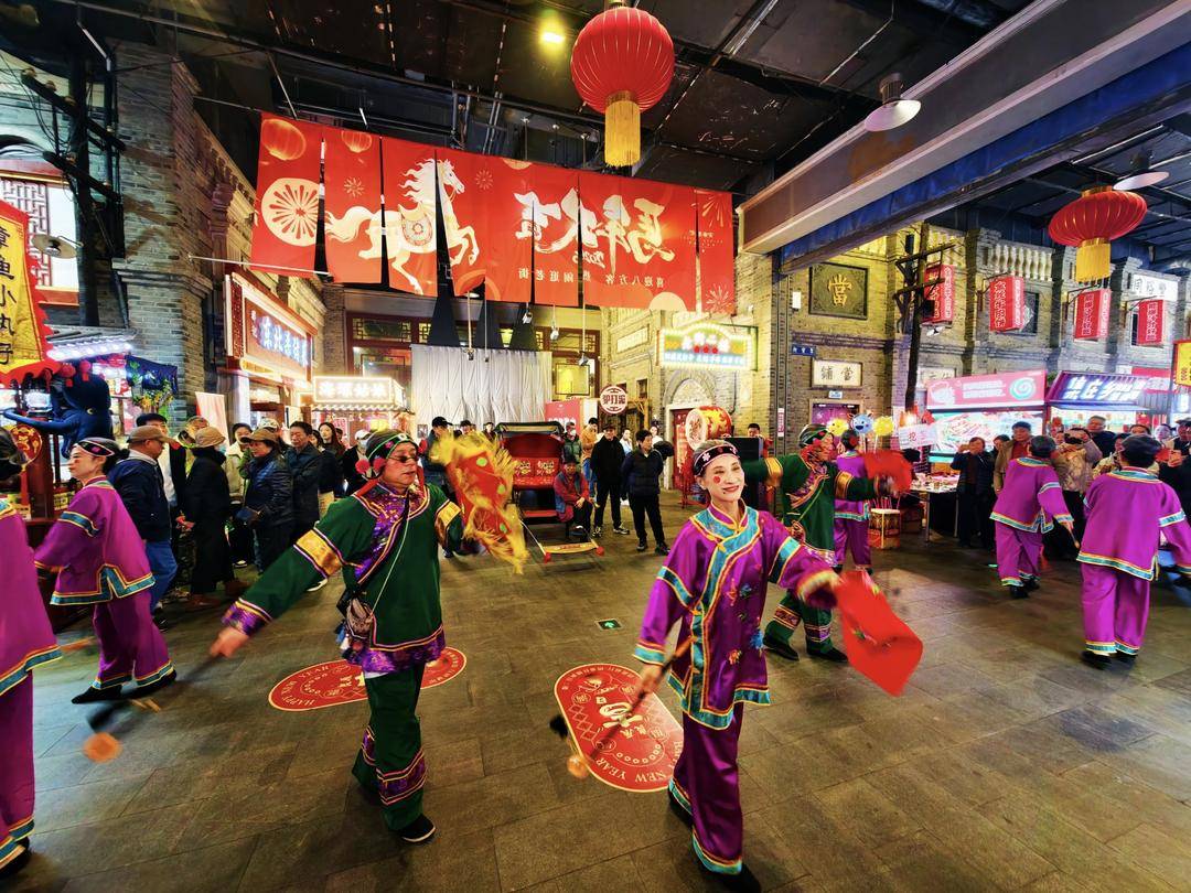青レンガに黒瓦、ネオンの灯りが映える。鼓楽の音色と共に美食の香りが漂う。安東老街は、81日間の消費促進活動を通じて、文化的伝統と消費の活力を深く融合させた。民俗芸能や無形文化遺産の展示が、老街の「ファン獲得の秘訣」となっている。臘八節(旧暦12月8日)の福粥振る舞いから元宵節の灯り祭りまで、老街は伝統的な祝日に合わせたイベントを次々と展開。影絵芝居や二人転などの惠民公演は連日満席となり、午年をテーマにした文化創意(文创)グッズや満族の巾着(荷包)などの手作り品は若者に好評だ。「龍頭を上げる・鼓楽が鳴る」丹東鼓楽公演は力強い響きで、市民や観光客に伝統文化の魅力を没入感あふれる形で体感させた。