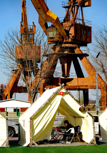 西海岸のキャンプエリアには、様々な形のテントが点在する。パラソルの下やテーブルの周りで、市民たちは輪になって語らい、料理を楽しみ、笑い声と夕日が美しく調和している。テントの中でグラスを掲げて歓談する人、屋外のコンロで忙しそうに料理をする人、芝生の上で子どもが走り回る姿も。工業風の古いクレーンと春のキャンプ風景が、独特の都市の賑わいを生み出している。
