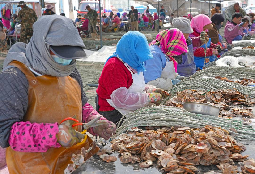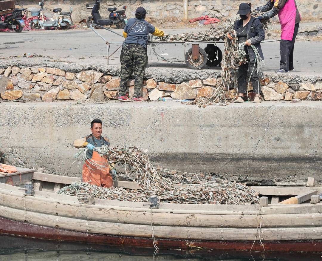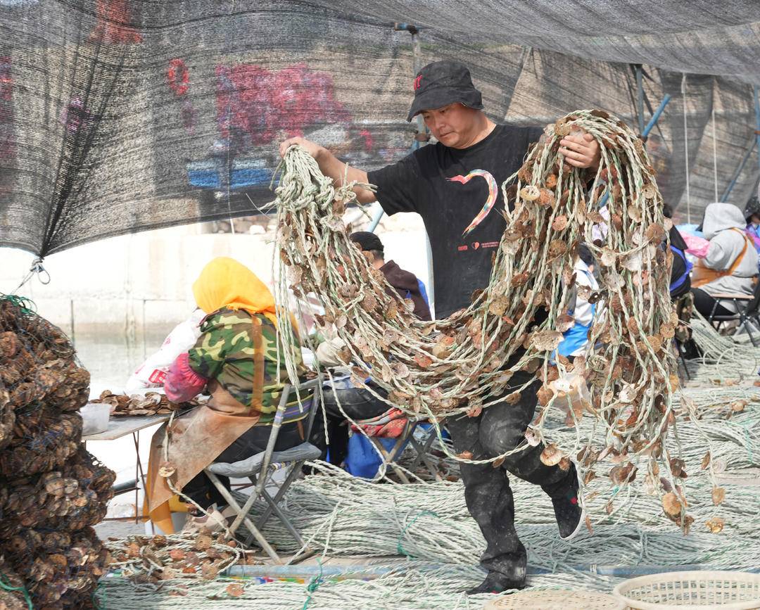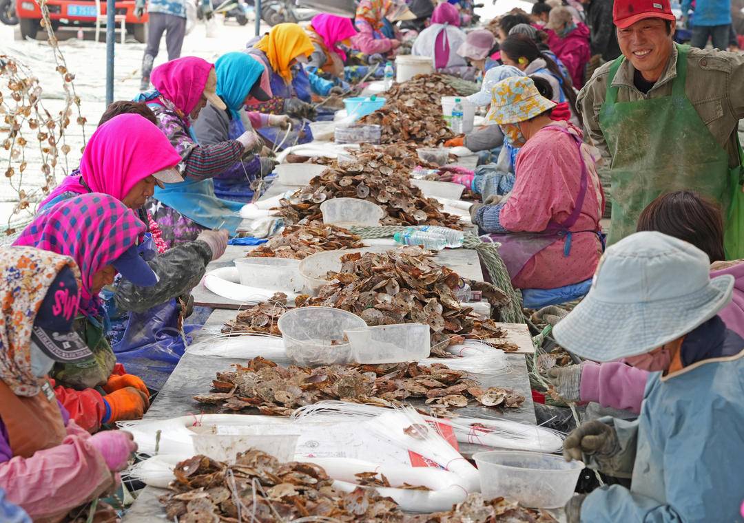 4月14日、大連市高新園区・竜王塘街道の南部海域沿岸で、作業員たちがロープに牡蠣の稚貝を挟み込む作業を行っている。4月中旬は、大連海域での牡蠣の人工養殖にとって最適な種苗投入の時期である。作業員たちは、稚貝の付いた貝殻をひとつなぎにし、ロープに等間隔に挟み込んで海へと投入。牡蠣を海中で自然に成長させる。大連沿海地域の旅順、竜王塘、金石灘、杏樹屯などの海域は牡蠣の名産地として知られ、その製品は国内外で広く販売されている。