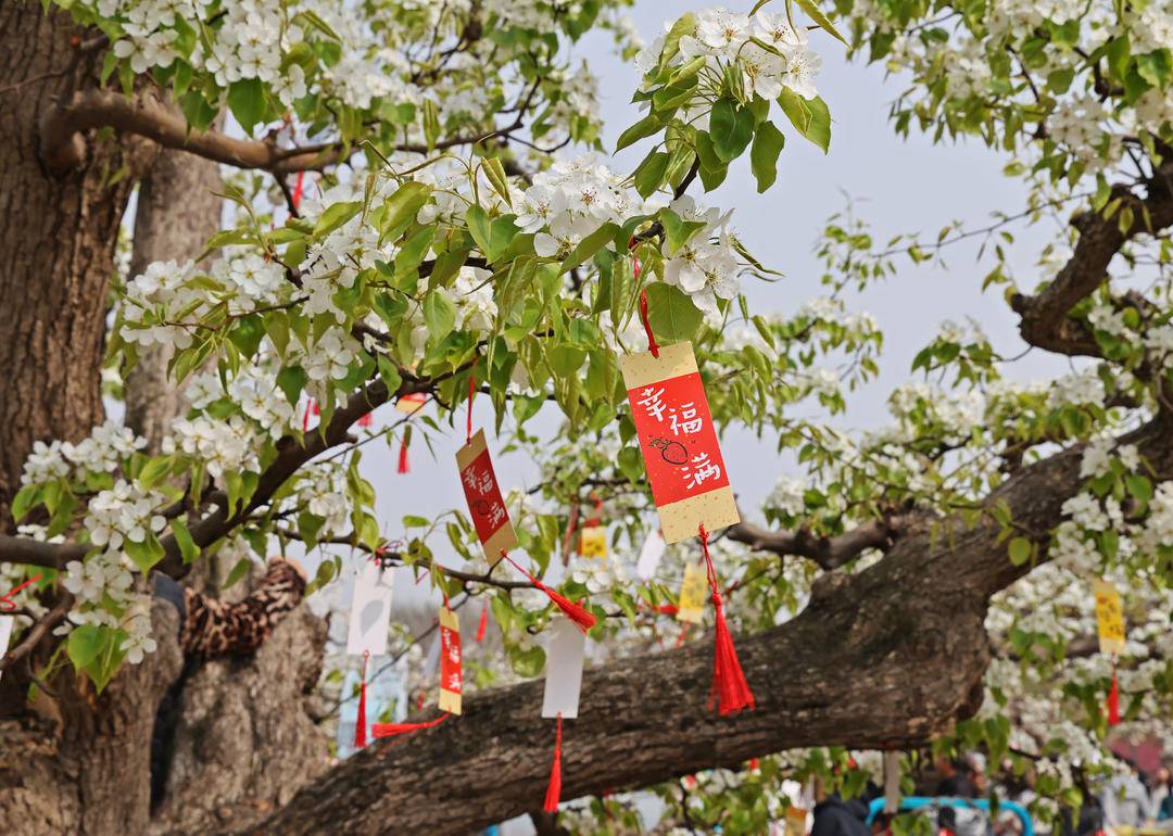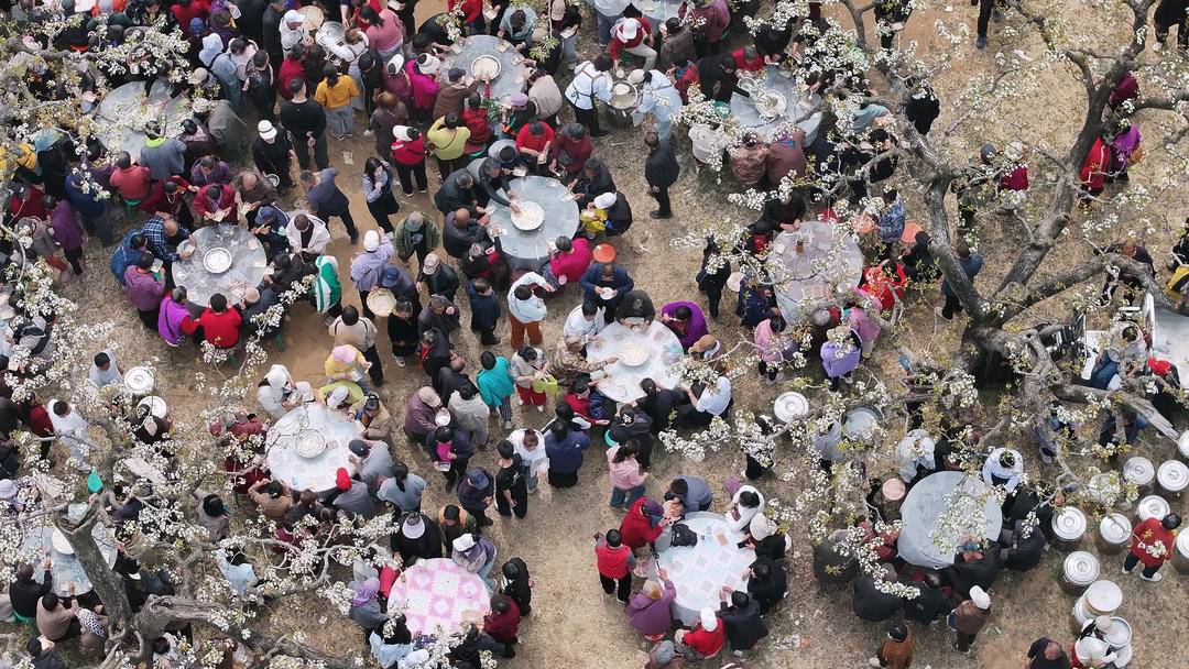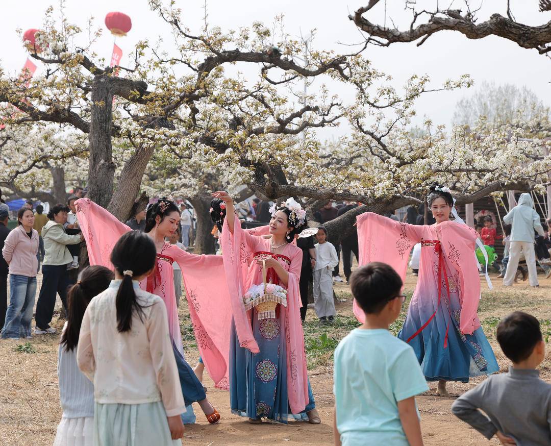 百年の歴史を持つ梨園の絶景を鑑賞し、無形文化遺産の特色ある美食を味わうことが、今回のイベントの核心的な見どころである。純白の梨の花が競うように咲き誇り、訪れた人々は花の間を散策しながら写真を撮る。古木と東屋が美しい対照をなし、春の詩情を醸し出している。会場には漢服レンタル、国風NPCとの交流、古木への祈願などのコーナーも設けられ、古風な雰囲気が満ちている。豆腐料理のエリアからは食欲をそそる香りが漂い、来場者は無料でなめらかで温かい綏中豆腐を味わい、香り高い高梁ご飯とともに、まさに遼西の風味を堪能できる。