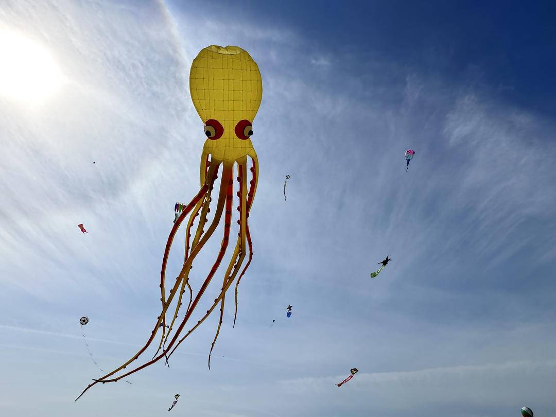 会場は熱気に満ち、200本以上の優美な凧が黒石礁公園の空を舞った。海洋動物の群れをモチーフにした現代的な凧から、百メートルの長龍、柔らかな羽の七仙女など大型伝統凧まで、軽やかに漂うもの、力強く躍動するもの、それぞれの弧の一つひとつに選手たちの熱意と知恵が込められている。
