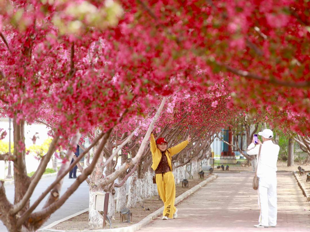 4月28日、国家4A級観光地の鞍山祥和リゾート・エステートでは、ピンク色の海棠の花が満開を迎え、大勢の観光客が写真撮影に訪れた。訪れた人々は海棠の花の下で自撮りをしたり、気分転換を楽しんだり、海棠の林を散策しながら詩のように美しい風景を満喫した。
