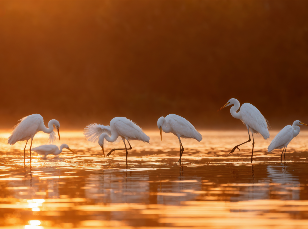 Когда первые лучи рассвета пробиваются сквозь темноту, набережная города Цзиньчжоу в провинции Ляонин напоминает потрясающую картину-свиток. Цапли либо грациозно стоят, либо расправляют крылья, чтобы взлететь; их белоснежные перья блестят в золотистом сиянии утреннего солнца. Их ловкие и живые фигуры придают безграничную жизненную силу этому мирному рассвету, полностью раскрывая очарование природы.