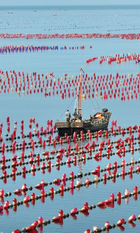 Рано утром солнце восходит на востоке. Окутанное сиянием восхода, морское ранчо в уезде Чанхай города Далянь провинции Ляонин открывает живописную картину.