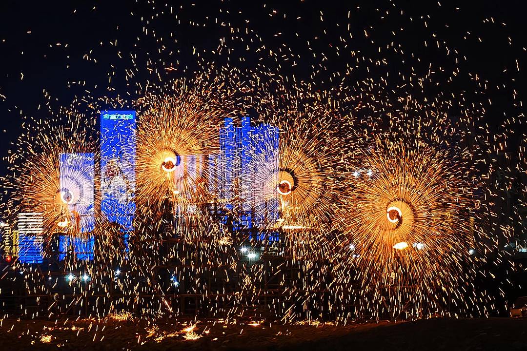 На днях на побережье залива Союй в Даляне провинции Ляонин , представления о нематериальном культурном наследии (НКН), такие как брызги золотистых искр озаряли все вокруг, и волны жара чувствовали зрители. Когда огонь встречался с морем, мастера размахивали пылающими горшками, высекая снопы искр, освещая ночное небо.