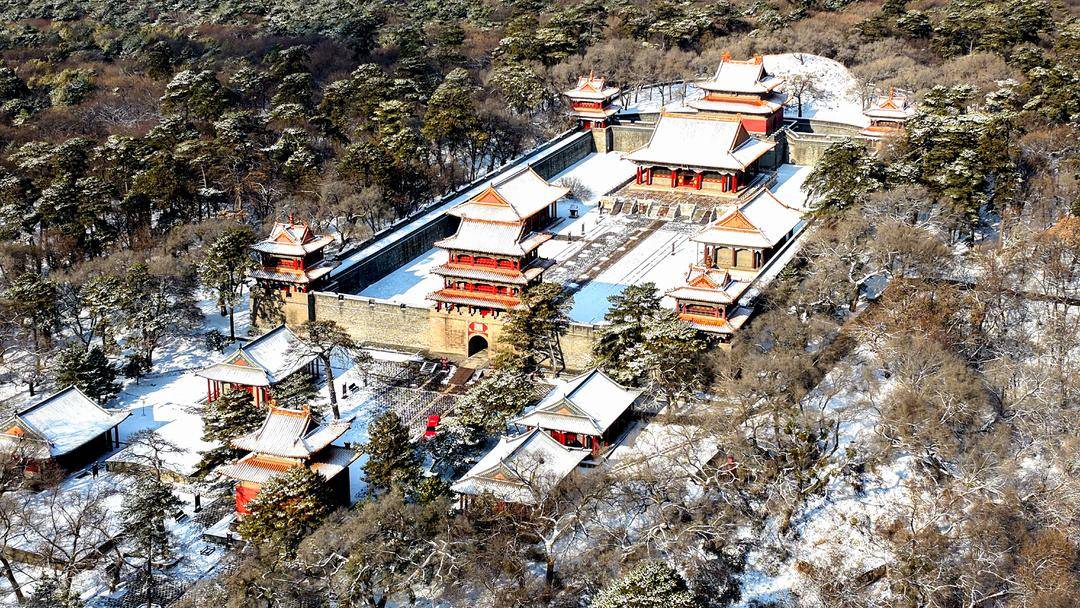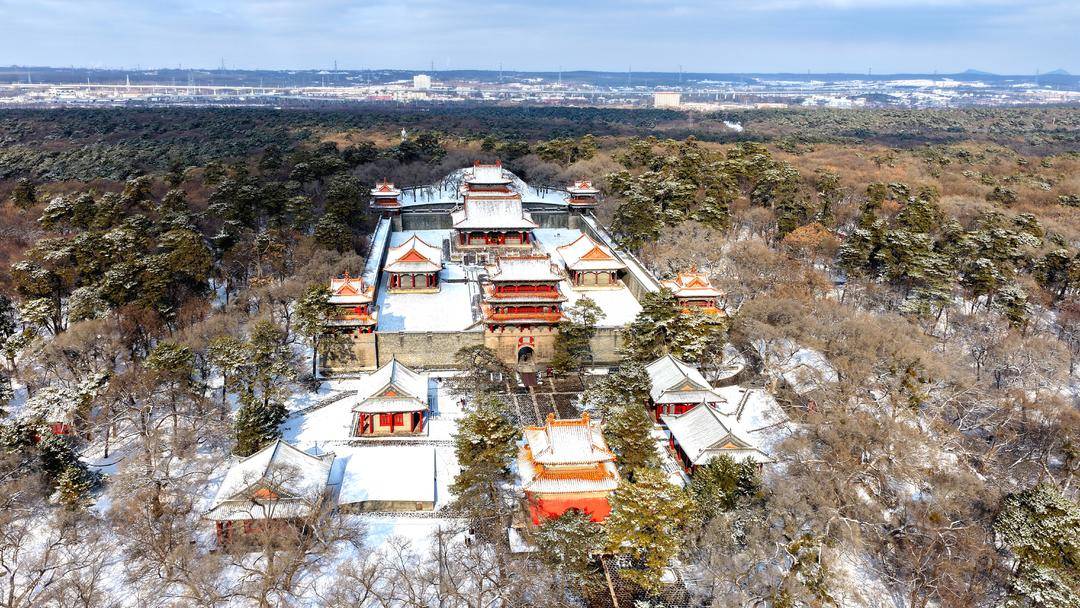 После снега парк Дунлин города Шэньян (провинция Ляонин) покрывается снегом, как будто серебром. Снег остается белым, сосны и кипарисы зеленеют, древние здания становятся еще более величественными, что создаёт уникальный пейзаж Шэньяна холодной зимой.