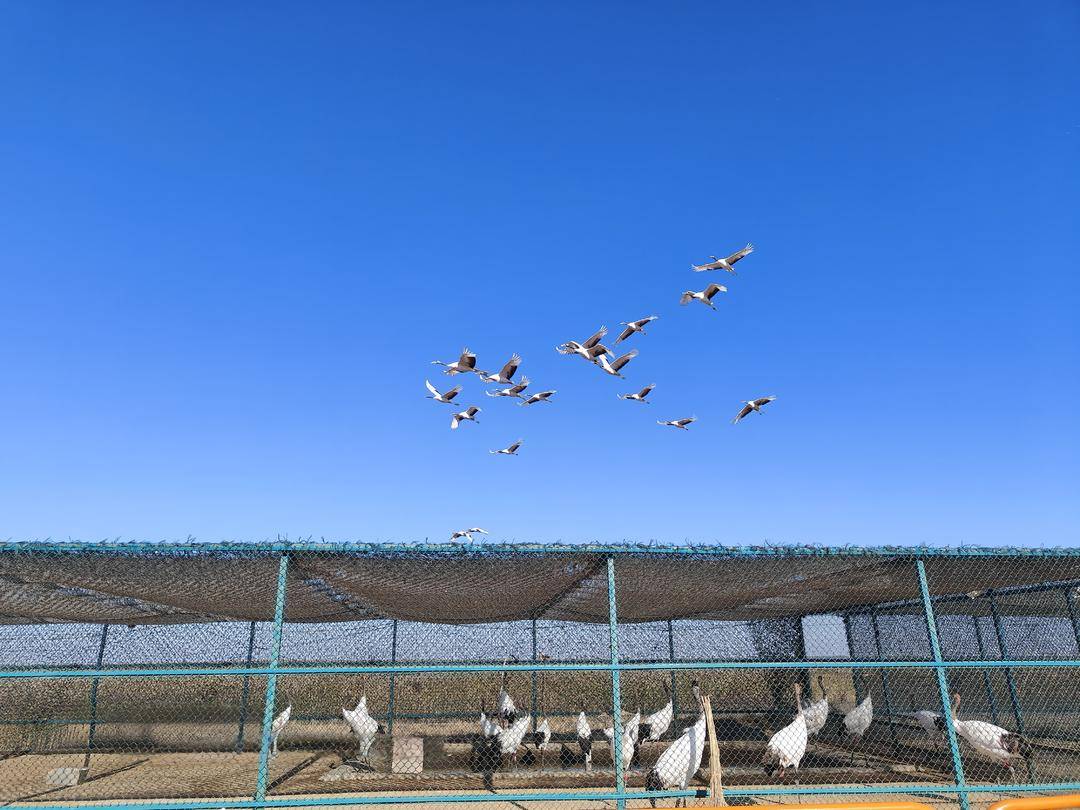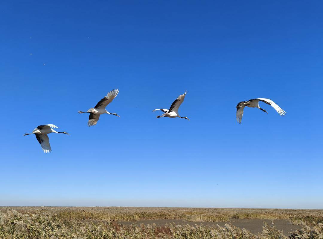 В болотистой местности устья реки Ляохэ золотистые волны переливаются насквозь . Красноклювые журавли добавляют очарования и красоты этому месту, создавая потрясающую природную картину.